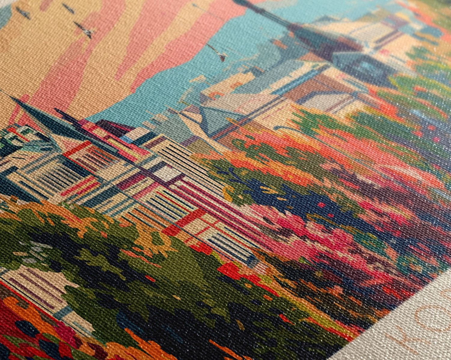 Most of our canvases are made in the USA, with the exception of canvases ordered with the light oak unstained frames, and any large canvases (24x48, 30x60, 16x48 and 20x60) ordered WITH a frame. These are temporarily made in and shipped from Europe, while we try to find a more consistent supplier in the USA.