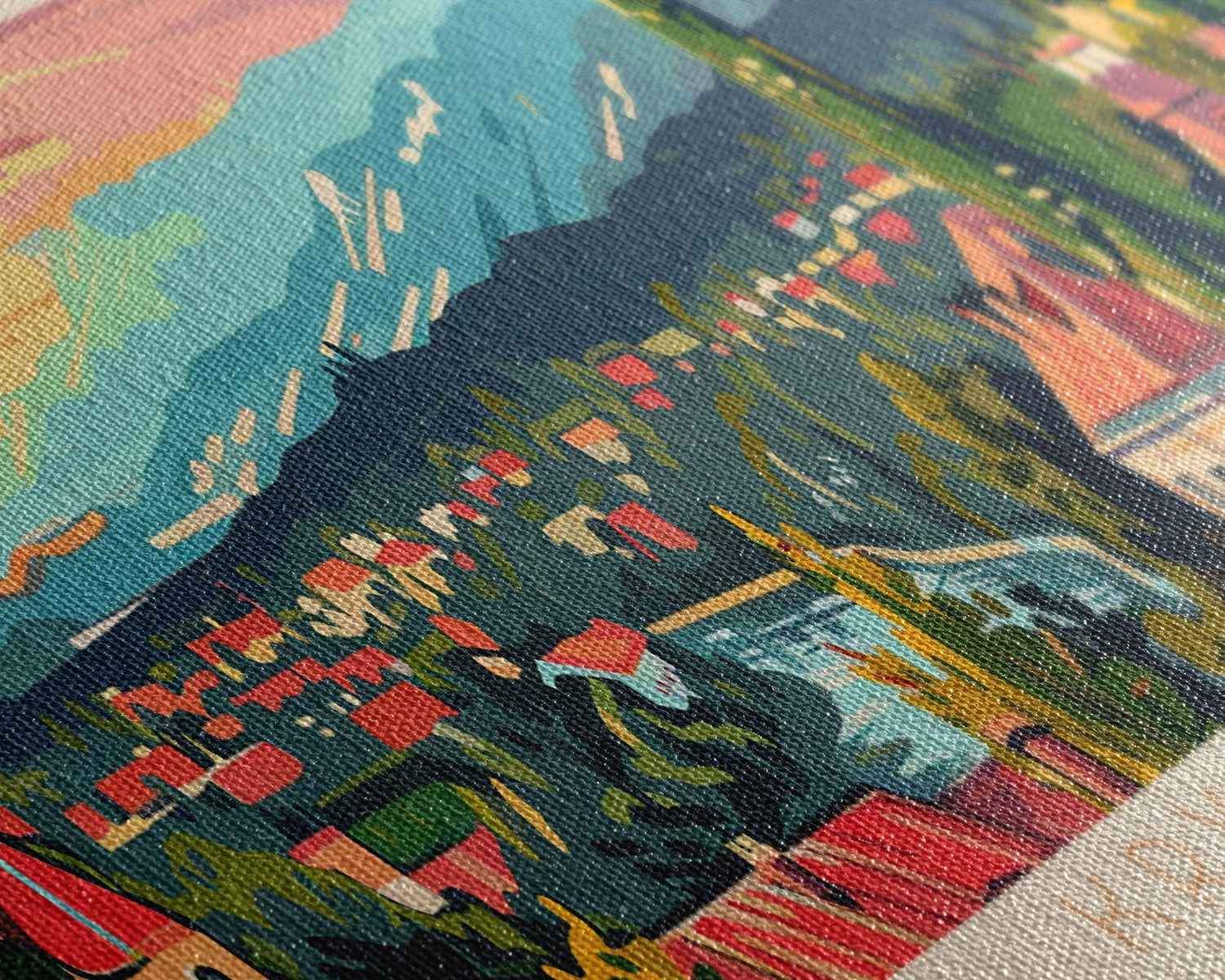 Most of our canvases are made in the USA, with the exception of canvases ordered with the light oak unstained frames, and any large canvases (24x48, 30x60, 16x48 and 20x60) ordered WITH a frame. These are temporarily made in and shipped from Europe, while we try to find a more consistent supplier in the USA.
