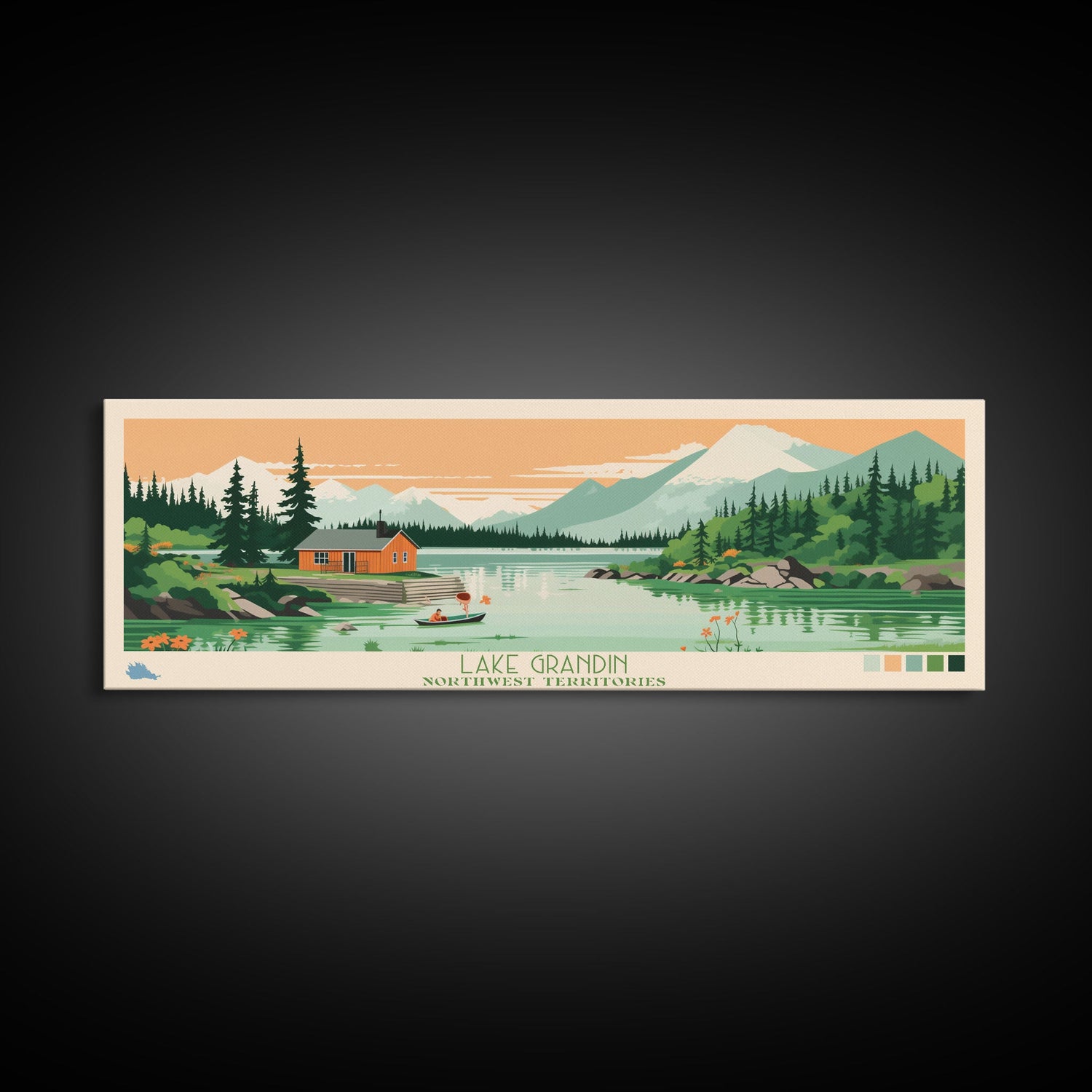 Lake Grandin Northwest Territories Framed Canvas Print, Panoramic Art, Midcentury Modern, Pop Art, Living Room Wall Art, Travel Poster, Lake House Decor - 10x30 Inches / Gallery Wrap Canvas - Ready To Hang is backordered and will ship as soon as it is back in stock.