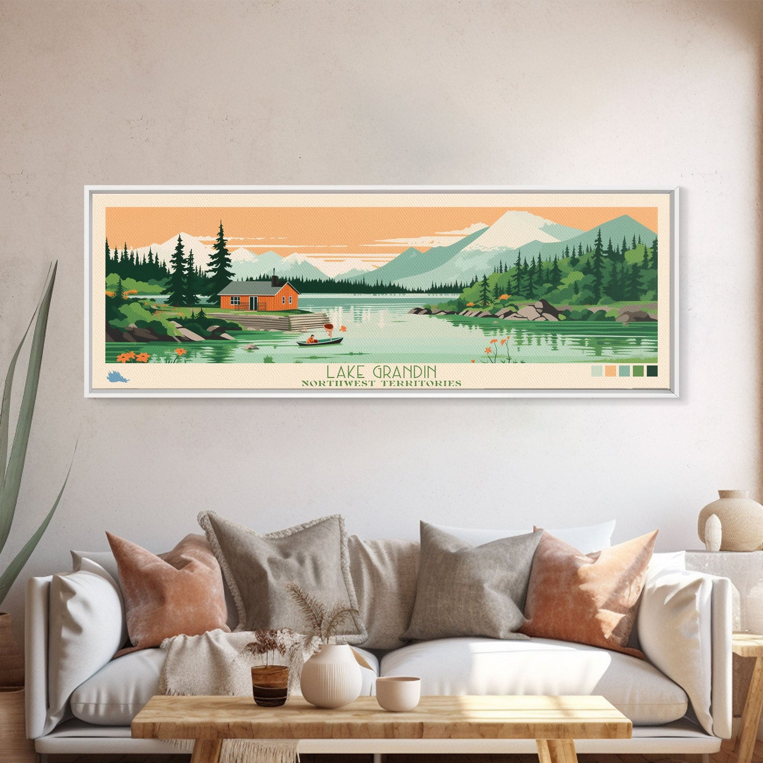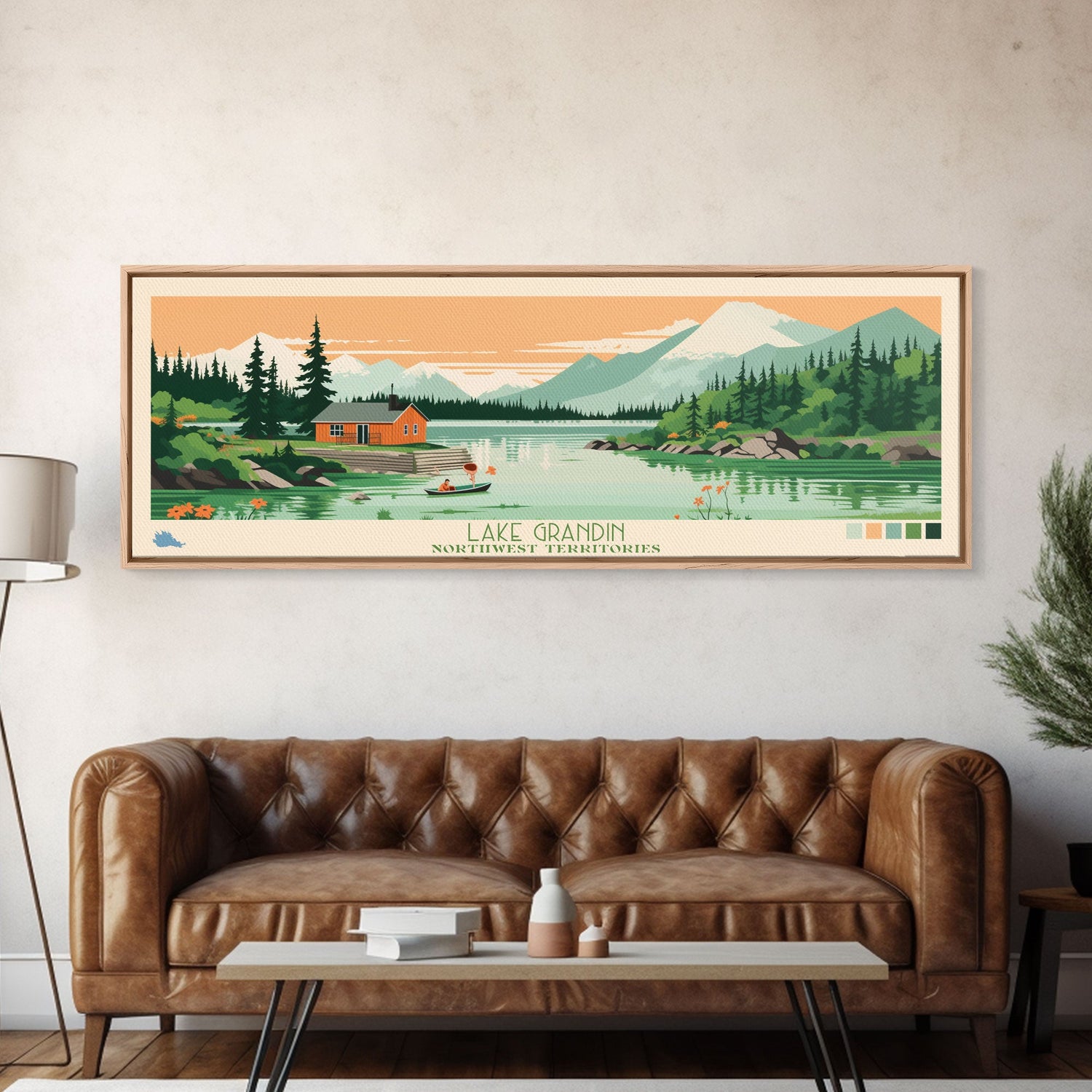 Lake Grandin Northwest Territories Framed Canvas Print, Panoramic Art, Midcentury Modern, Pop Art, Living Room Wall Art, Travel Poster, Lake House Decor