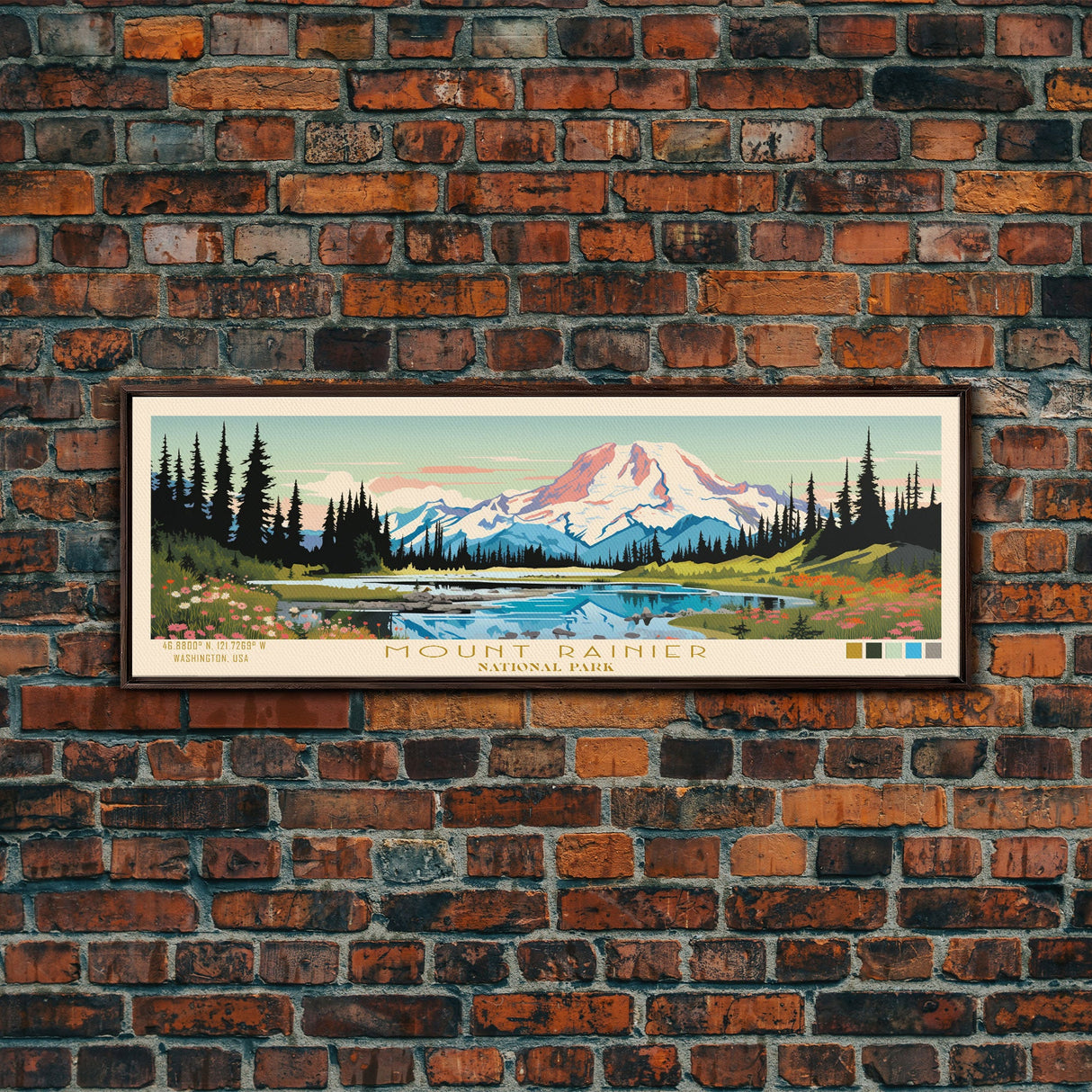 Mount Rainier National Park Panoramic Washington Travel Art, National Park Print, Minimalist Travel Art, Midcentury Modern Style Landscape - 10x30 Inches / No Frame - Stretched Canvas Only is backordered and will ship as soon as it is back in stock.