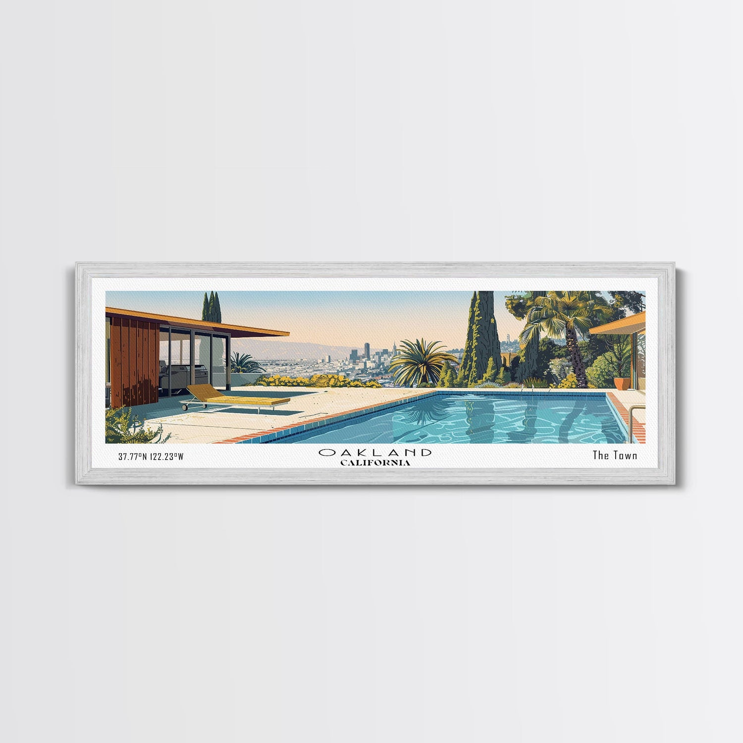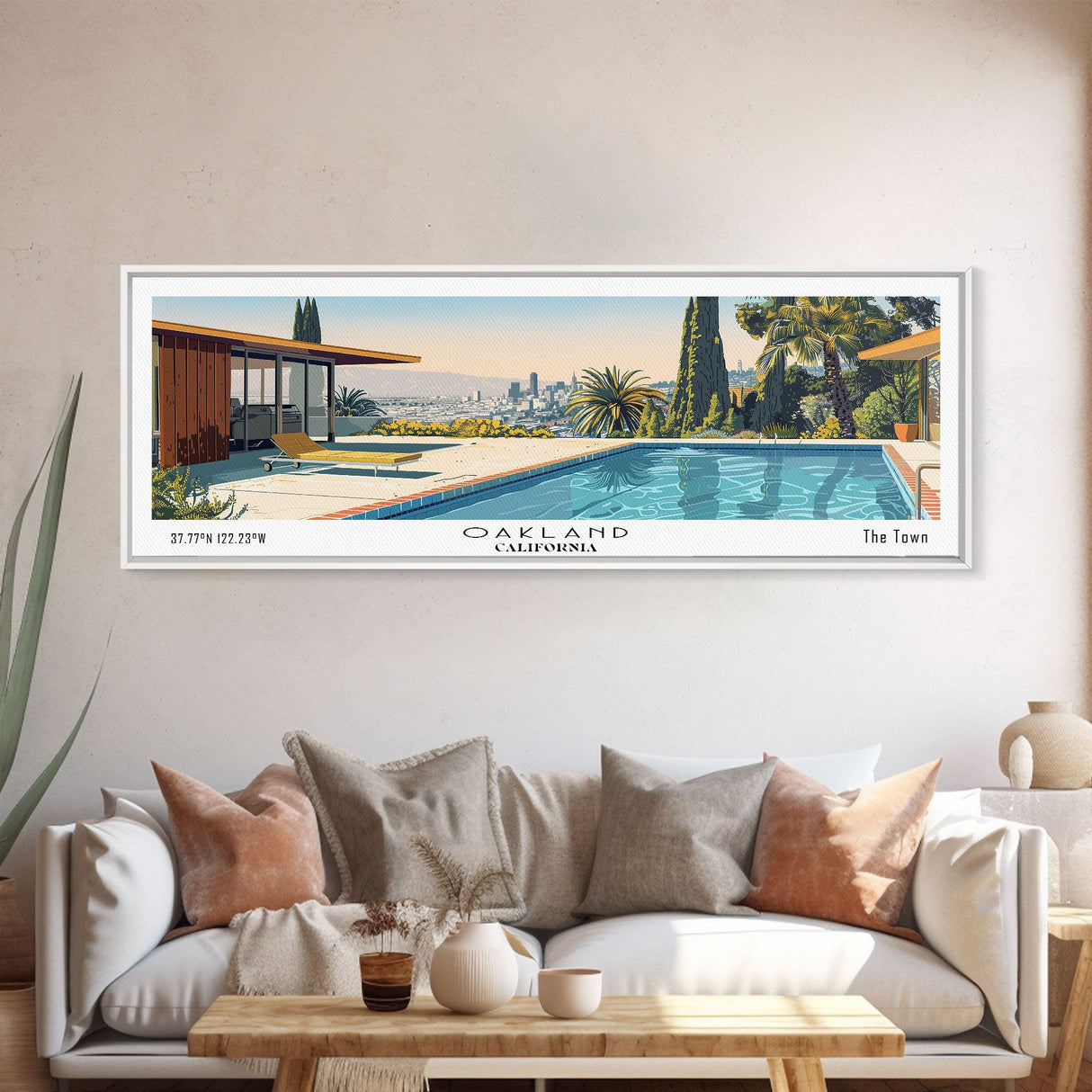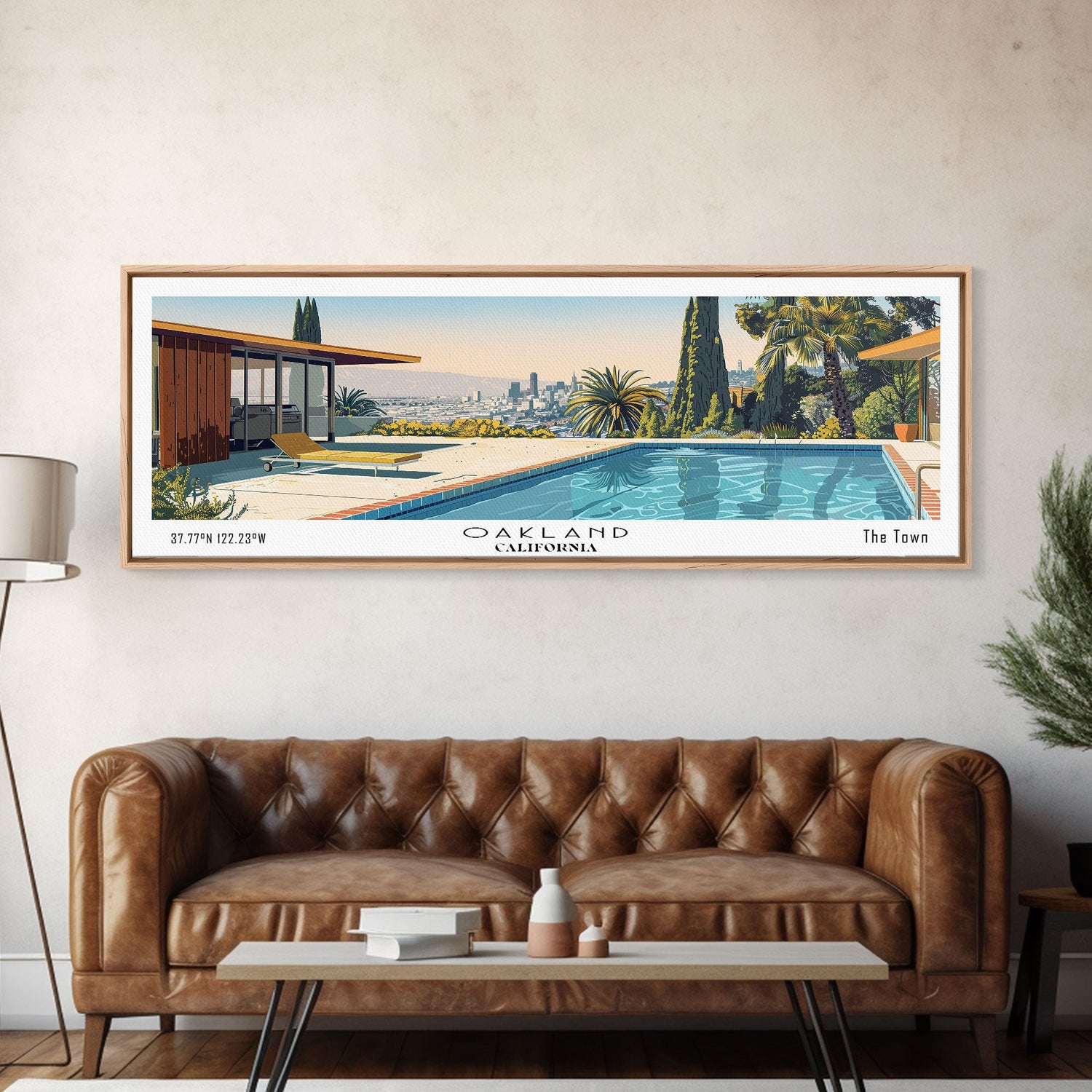 Oakland California Panoramic Painting, Mid Century Modern Framed Canvas Print, Retro Pop Art Travel Poster, City Art, Office Wall Decor, Living Room Art