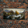 Scenic nature landscape canvas print, flowing river water color, fall scenic art, panoramic nature landscape