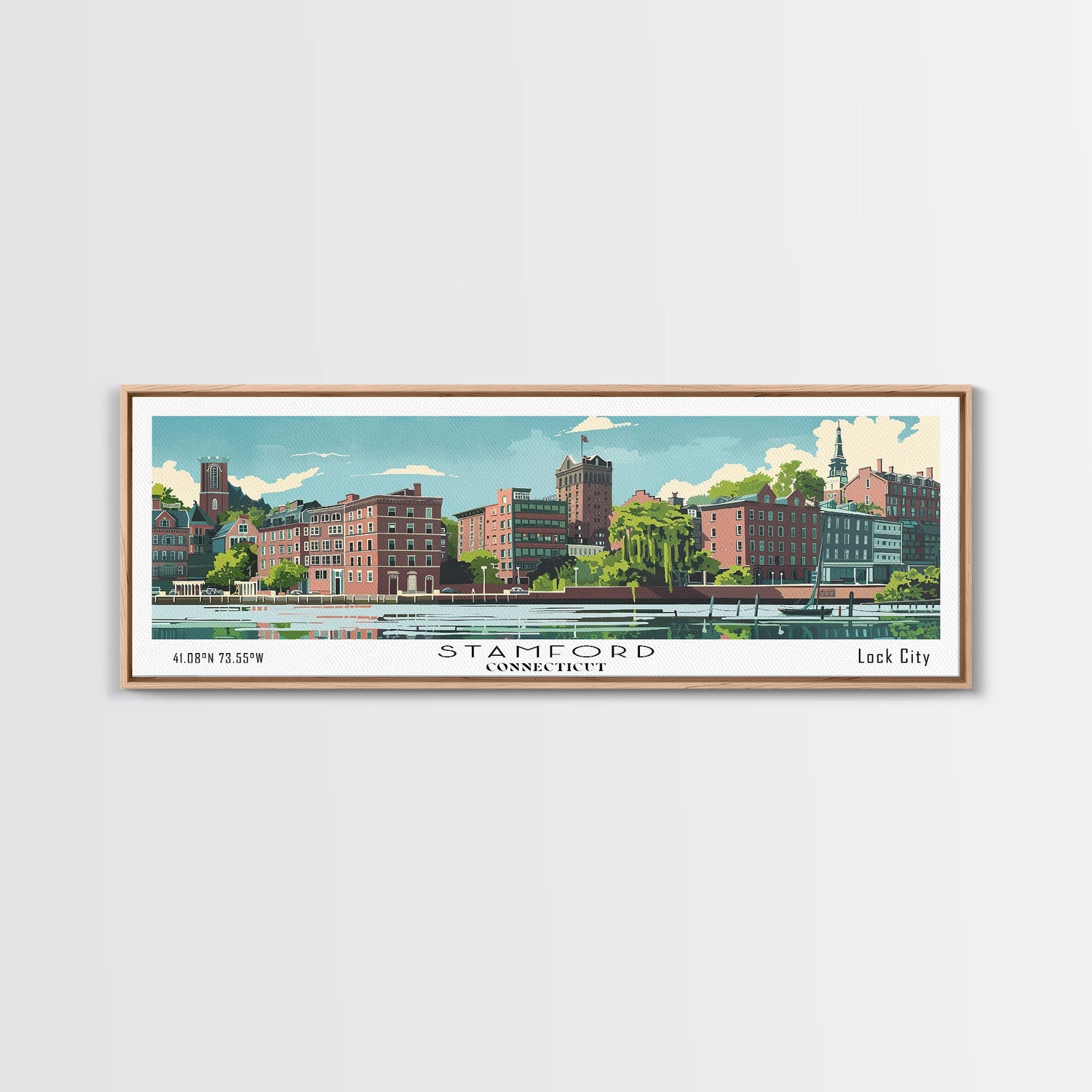 Stamford Connecticut Panoramic Wall Art, Mid Century Modern Framed Canvas Print, Retro Pop Art Travel Poster, Living Room and Office Decor