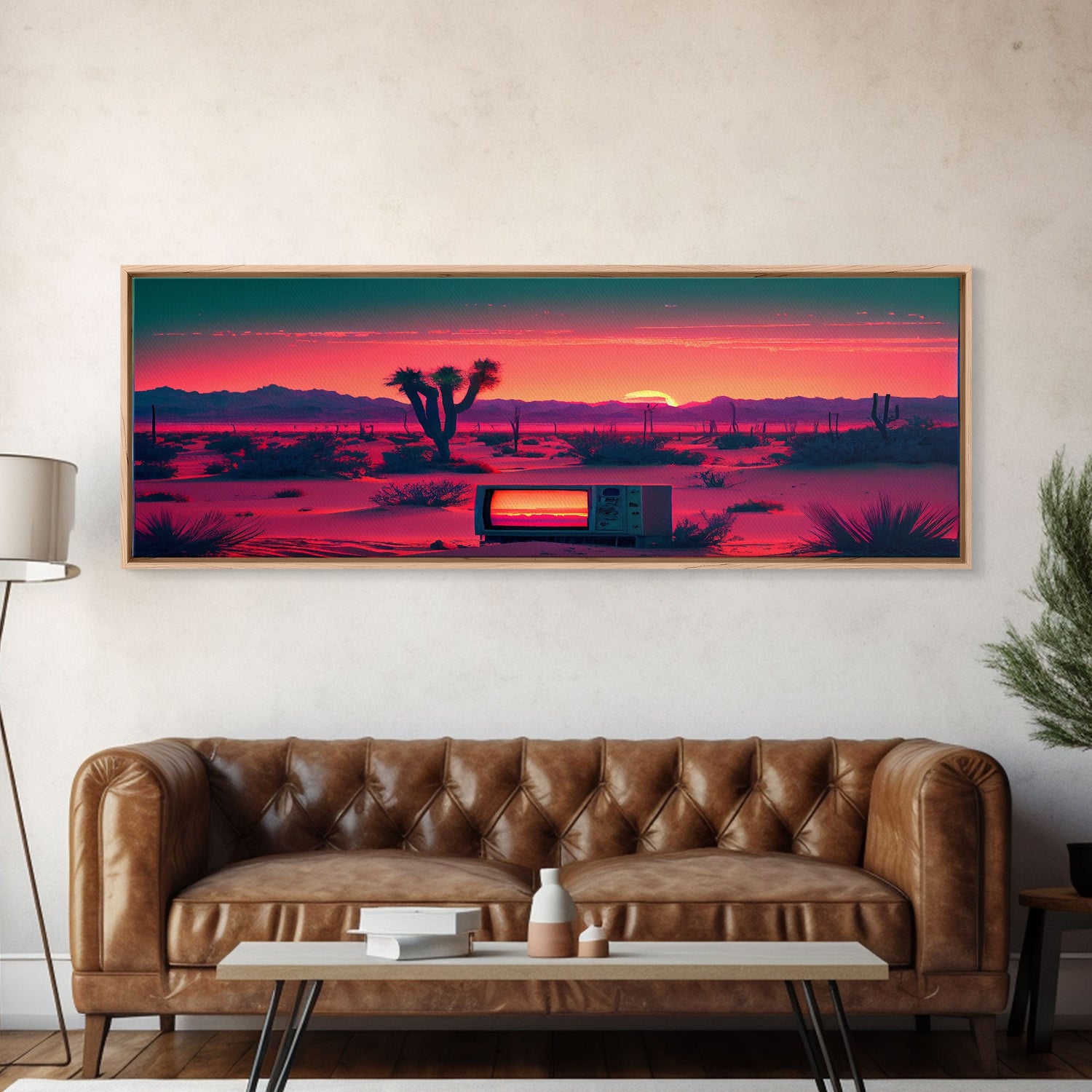 Surrealist Art, Retro TV Abandoned In The Desert, Statement Piece, but what? - Framed Canvas Print - Synthwave Sunset Desert Art - 10x30 Inches / No Frame - Stretched Canvas Only is backordered and will ship as soon as it is back in stock.