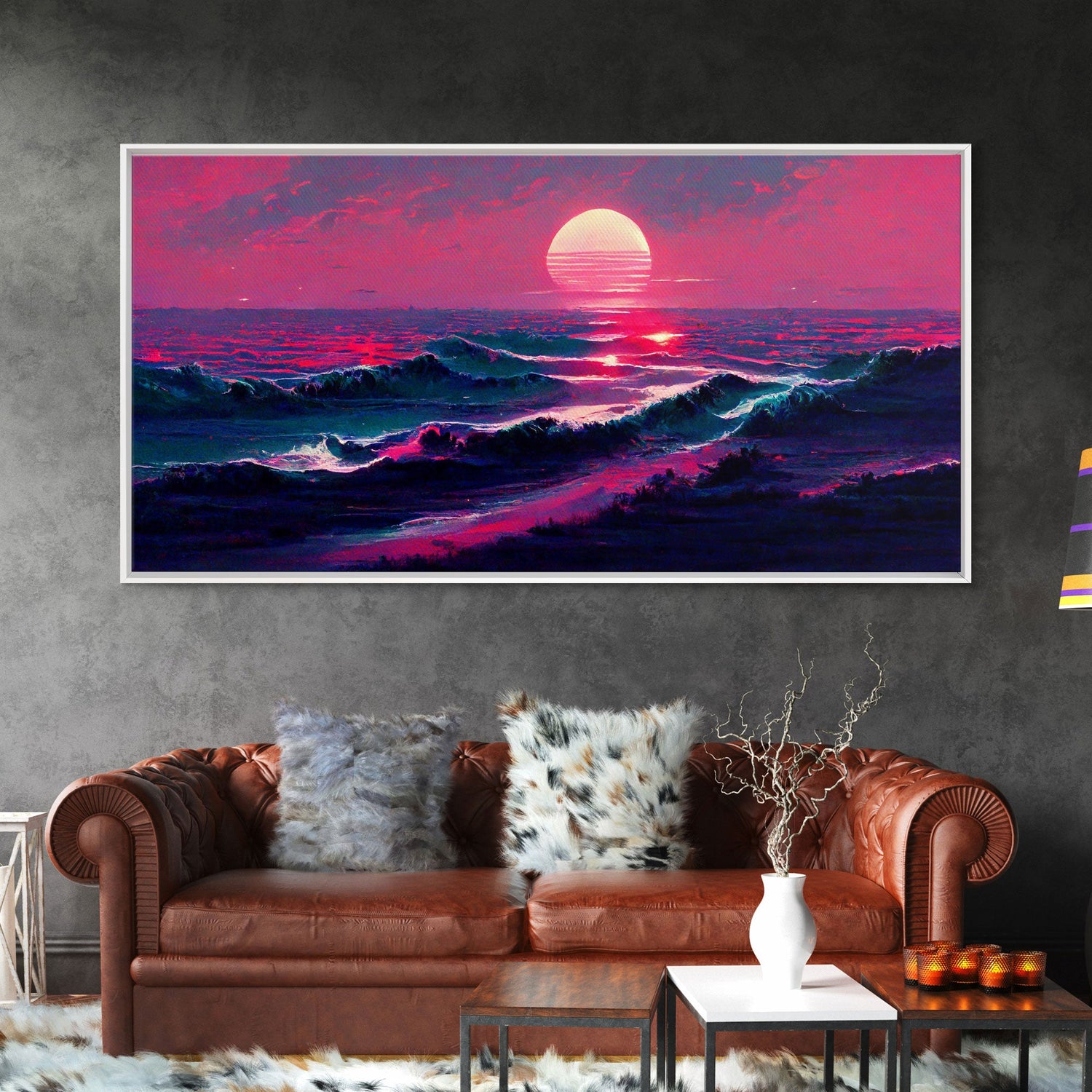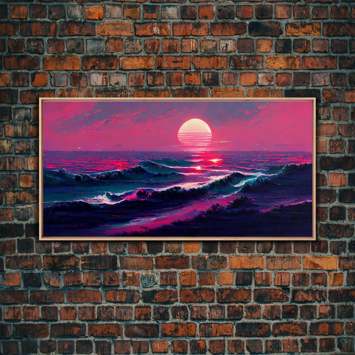 Synth wave sunset, ocean painting canvas print, outrun style, sun set art, wall decor, Made in Texas, ocean sunset, beach vaporwave