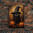 The Witch Cat With Her Jack O Lanterns, Framed Canvas Print, Dark Academia Halloween Art, Victorian Cat Oil Painting, Goth Halloween Decor
