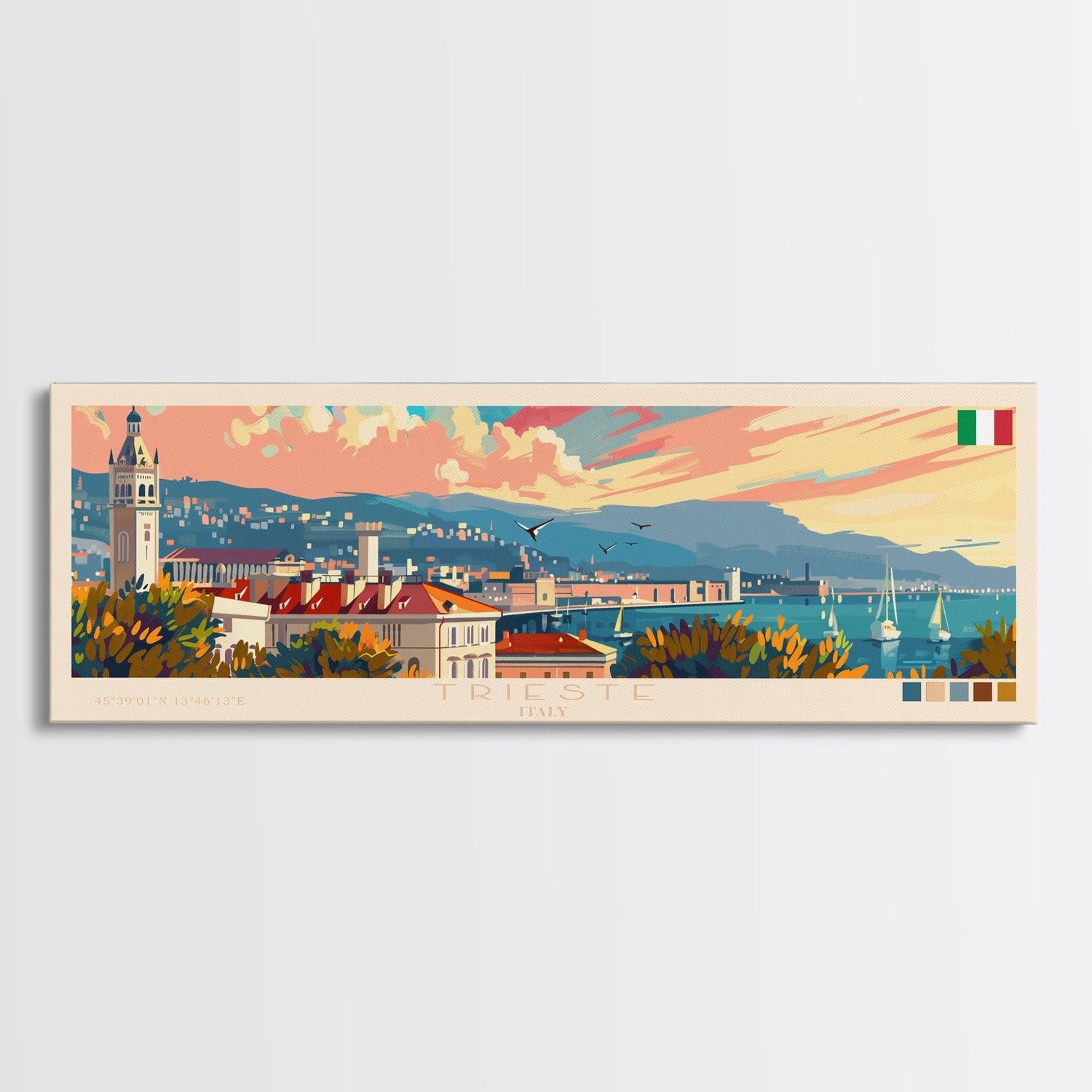 Trieste Italy Panoramic Travel Poster, Framed Canvas Print or Metal Wall Art, Travel Art, Home Decor, Panoramic Painting, Midcentury Art - 10x30 Inches / Gallery Wrap Canvas - Ready To Hang is backordered and will ship as soon as it is back in stock.