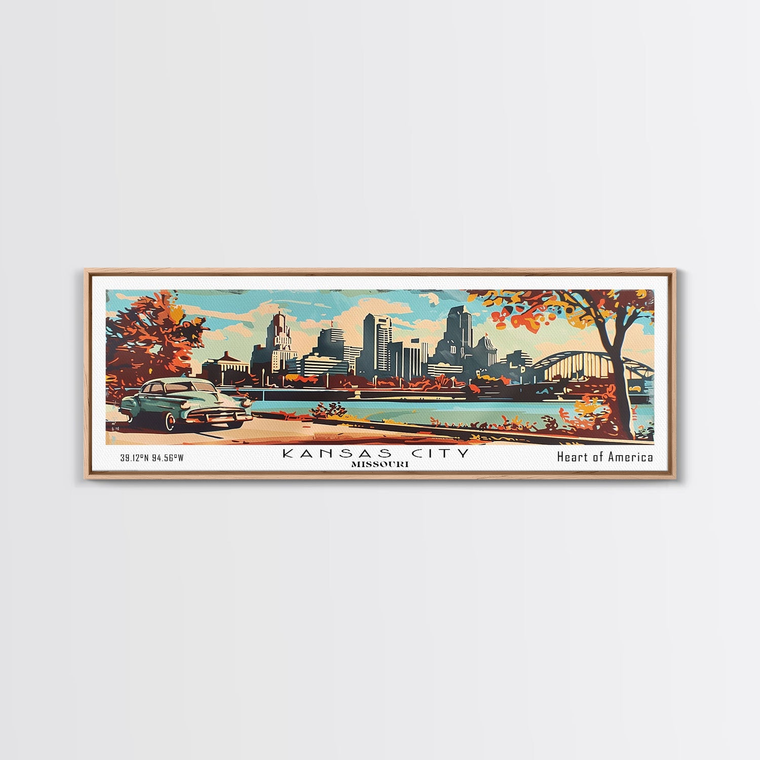 Kansas City Missouri Panoramic Wall Art, Mid Century Modern Framed Canvas Print, Retro Pop Art Travel Poster, Home Decor, Office Art, Gift Idea, Wall Hanging