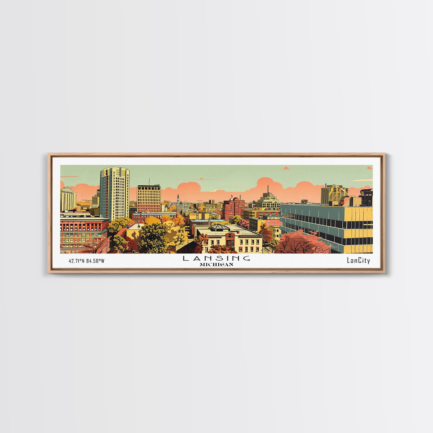 Lansing Michigan Panoramic Wall Art, Mid Century Modern Framed Canvas Print, Retro Pop Art Travel Poster, Living Room Decor