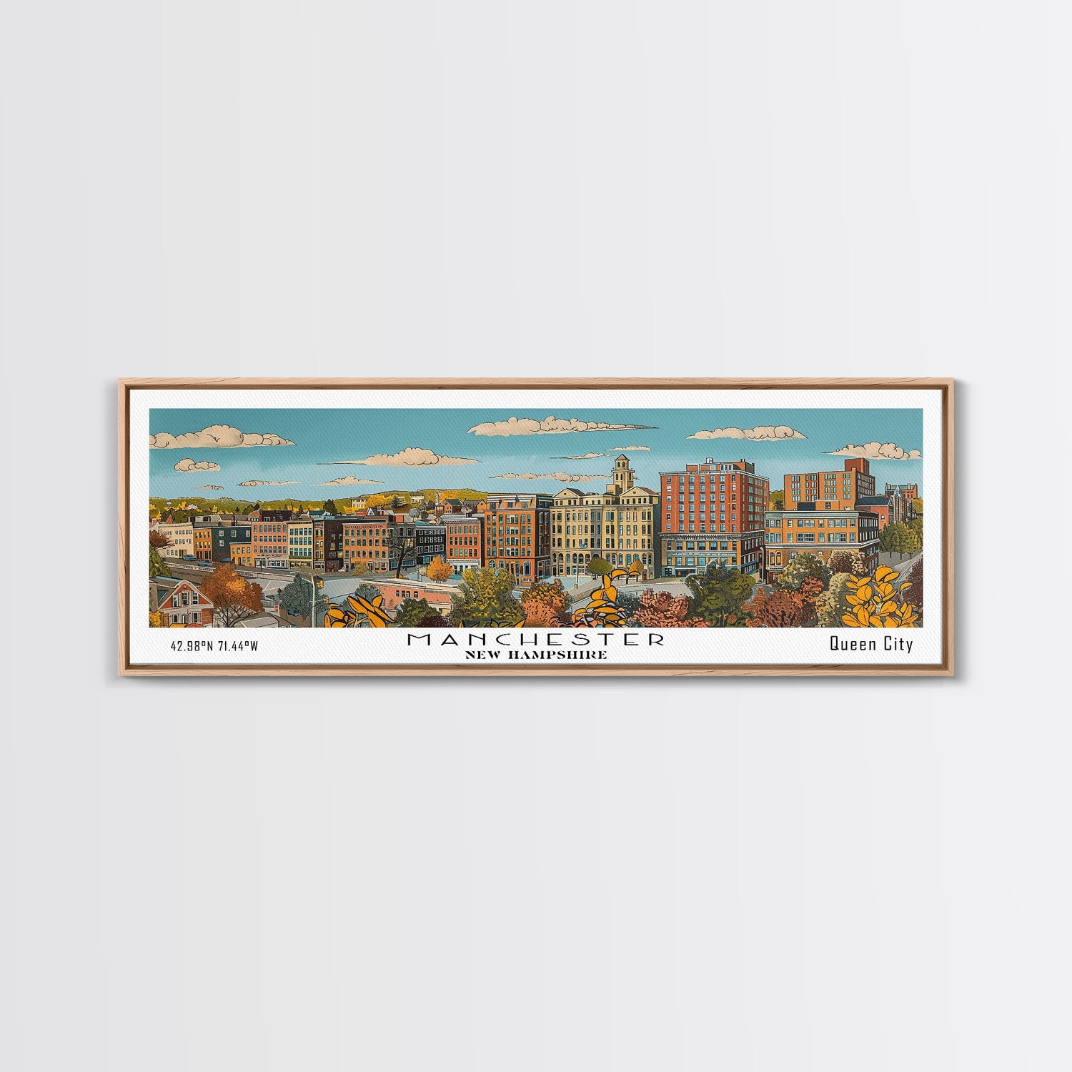 Manchester New Hampshire Panoramic Painting, Mid Century Modern Framed Canvas Print, Retro Pop Art Travel Poster, Living Room Decor