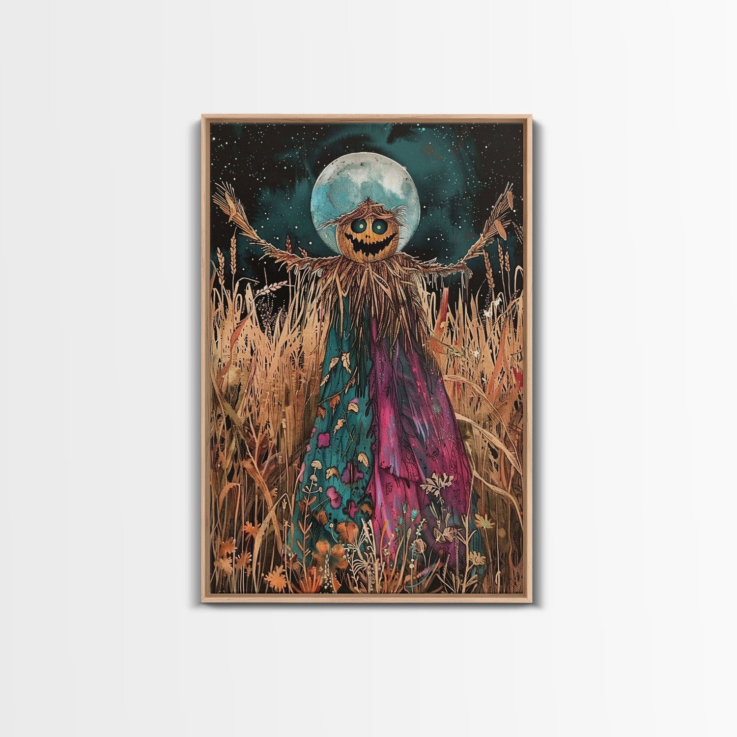 Spooky Scarecrow in Field Framed Canvas Print, Haunted Field Decor, Halloween Scarecrow Art, Eerie Harvest Wall Art, Creepy Scarecrow Print