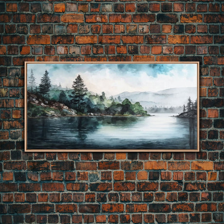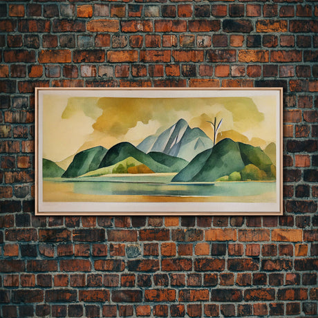 Serene Green Watercolor Landscape, Canvas Print, abstract wall art of a lake and mountains