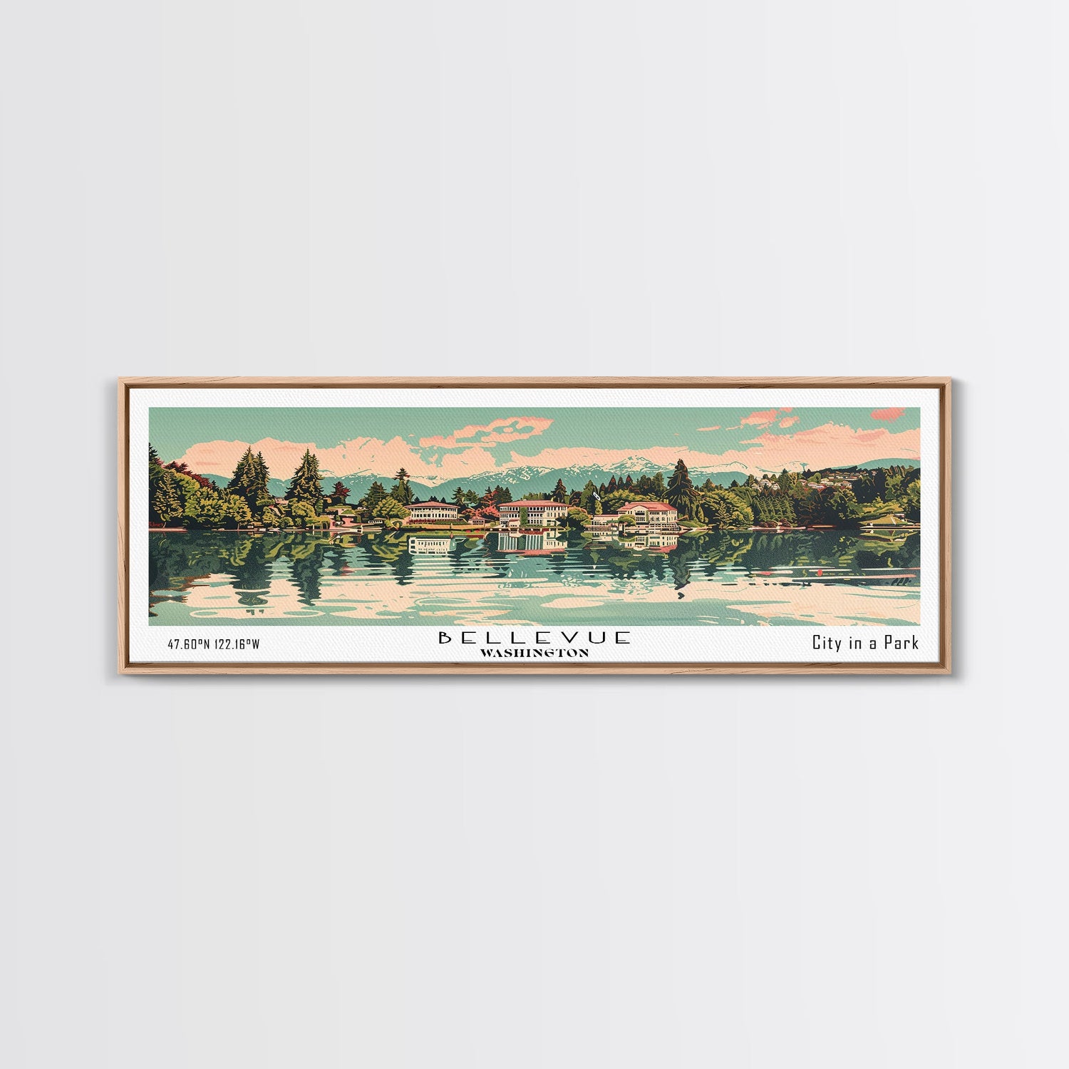 Bellevue Washington Panoramic Painting, Mid Century Modern Framed Canvas Print, Retro Pop Art Travel Poster, Office Wall Art, City Print