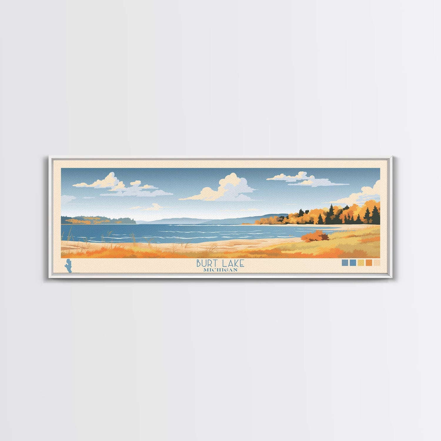 Burt Lake Michigan Framed Canvas Print, Pop Art Panoramic Travel Poster, Midcentury Modern, Wall Art, Scenic Nature Painting, Bedroom Decor