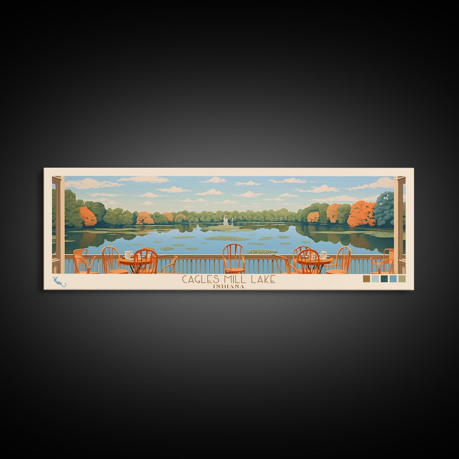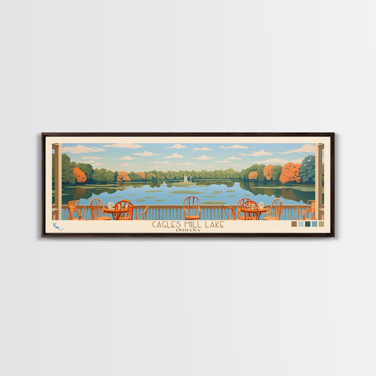 Cagles Mill Lake Indiana Framed Canvas Print, Midcentury Modern Panoramic Wall Art, Living Room Decor, Pop Art, Travel Poster Art, Scenic Nature Painting
