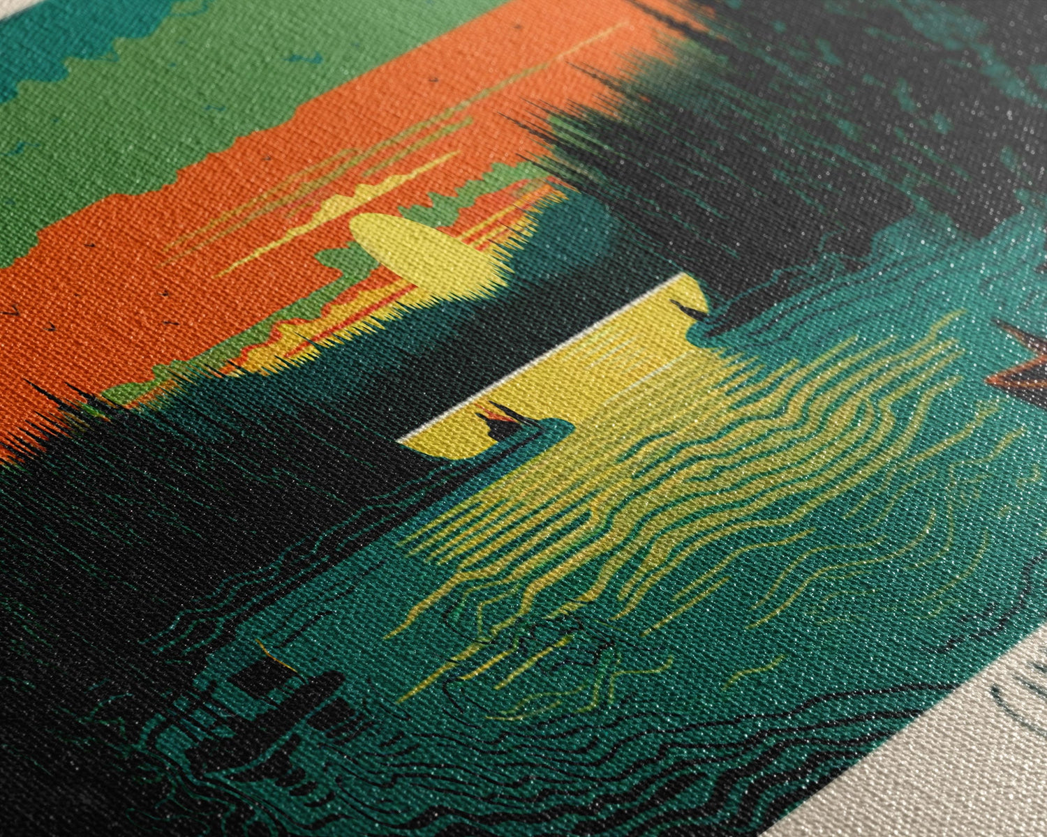 Candle Lake Saskatchewan Framed Canvas Print, Midcentury Modern Panoramic Wall Art, Living Room Decor, Pop Art, Travel Poster Art, Scenic Nature Painting