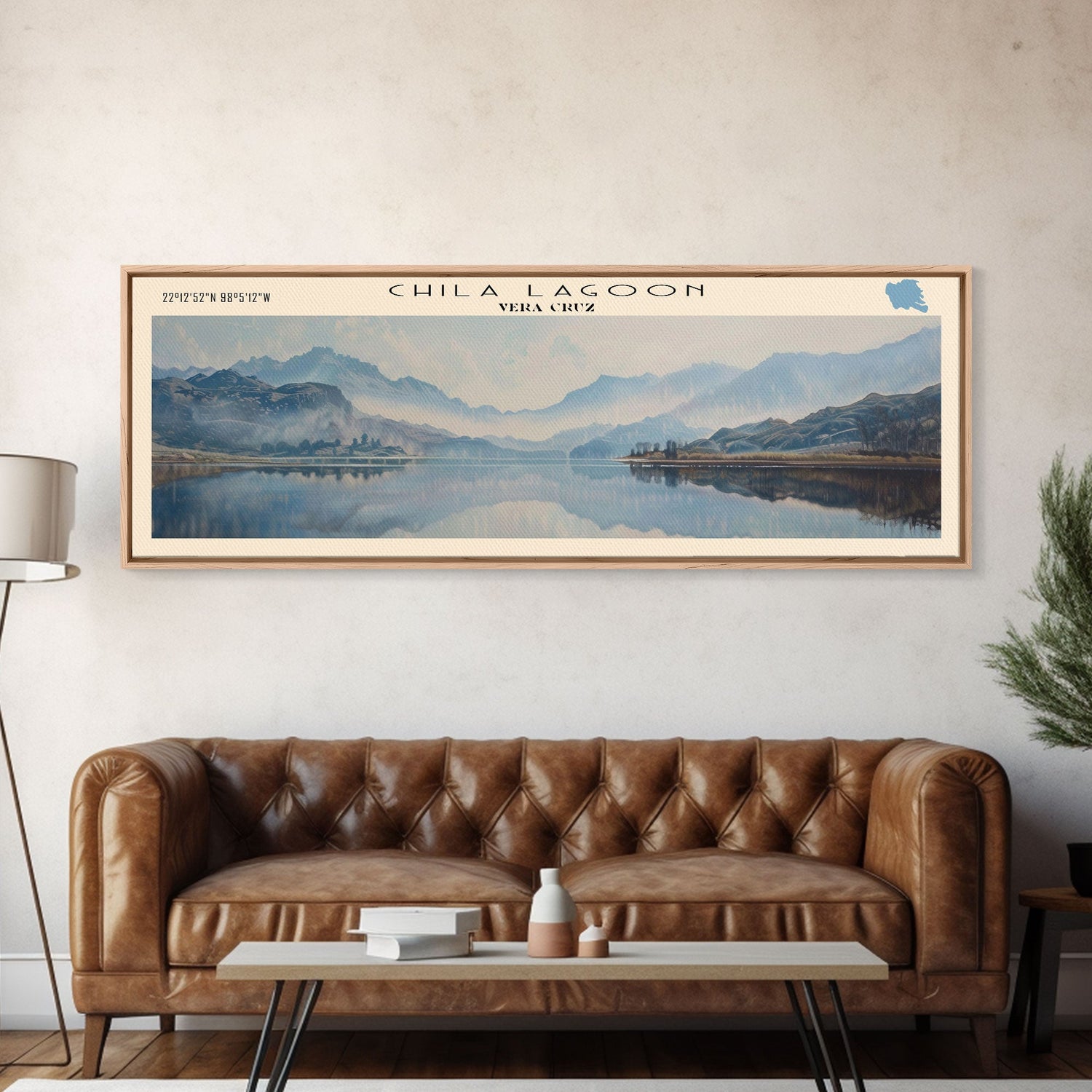 Chila Lagoon Framed Canvas Print, Panoramic Lake House Decor, Wide Wall Art, Travel Poster, Rustic Lake Painting, Home Decor