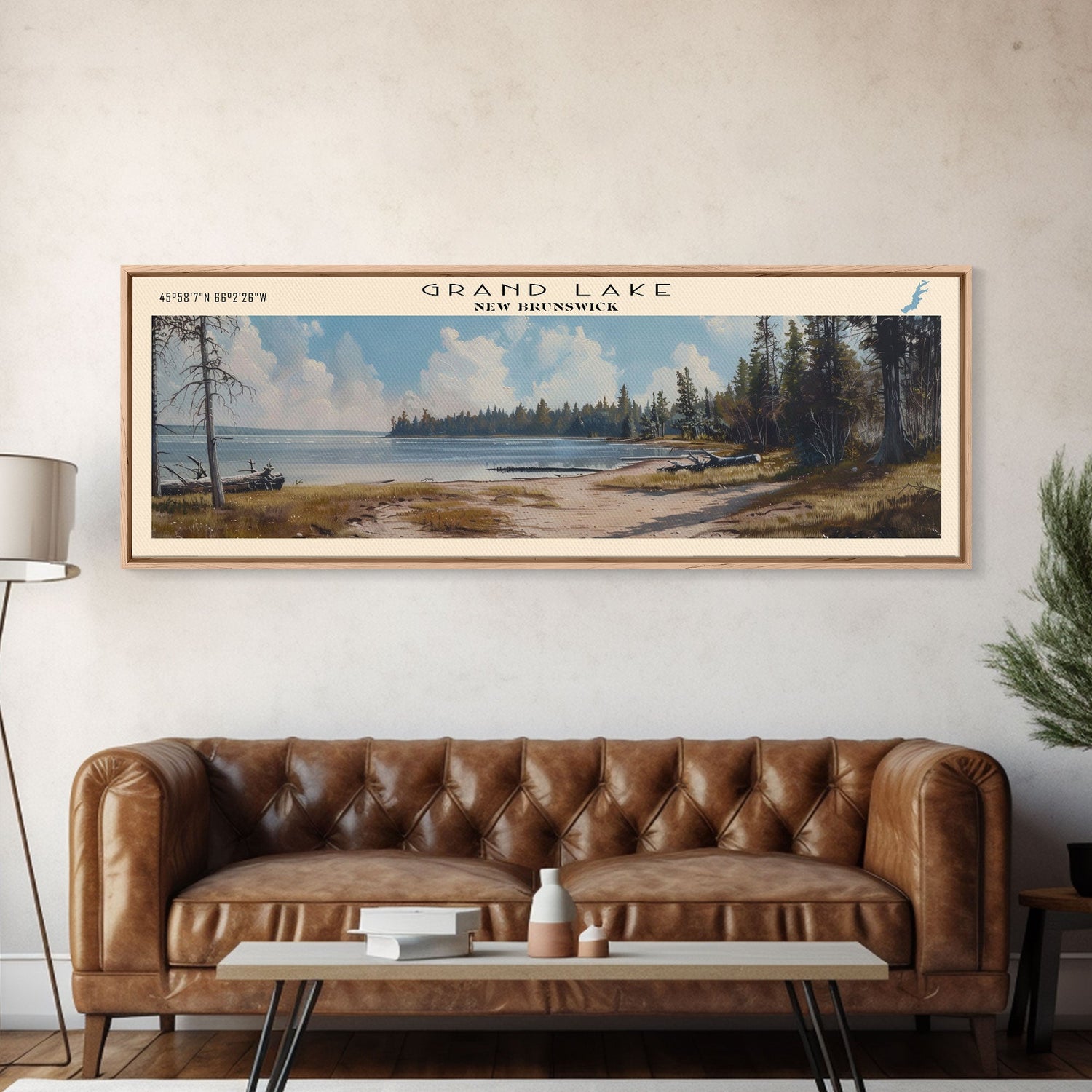 Grand Lake Canada New Brunswick Framed Canvas Print, Panoramic Lake House Decor, Wall Art, Travel Poster, Peaceful Lake Painting, Nature Art