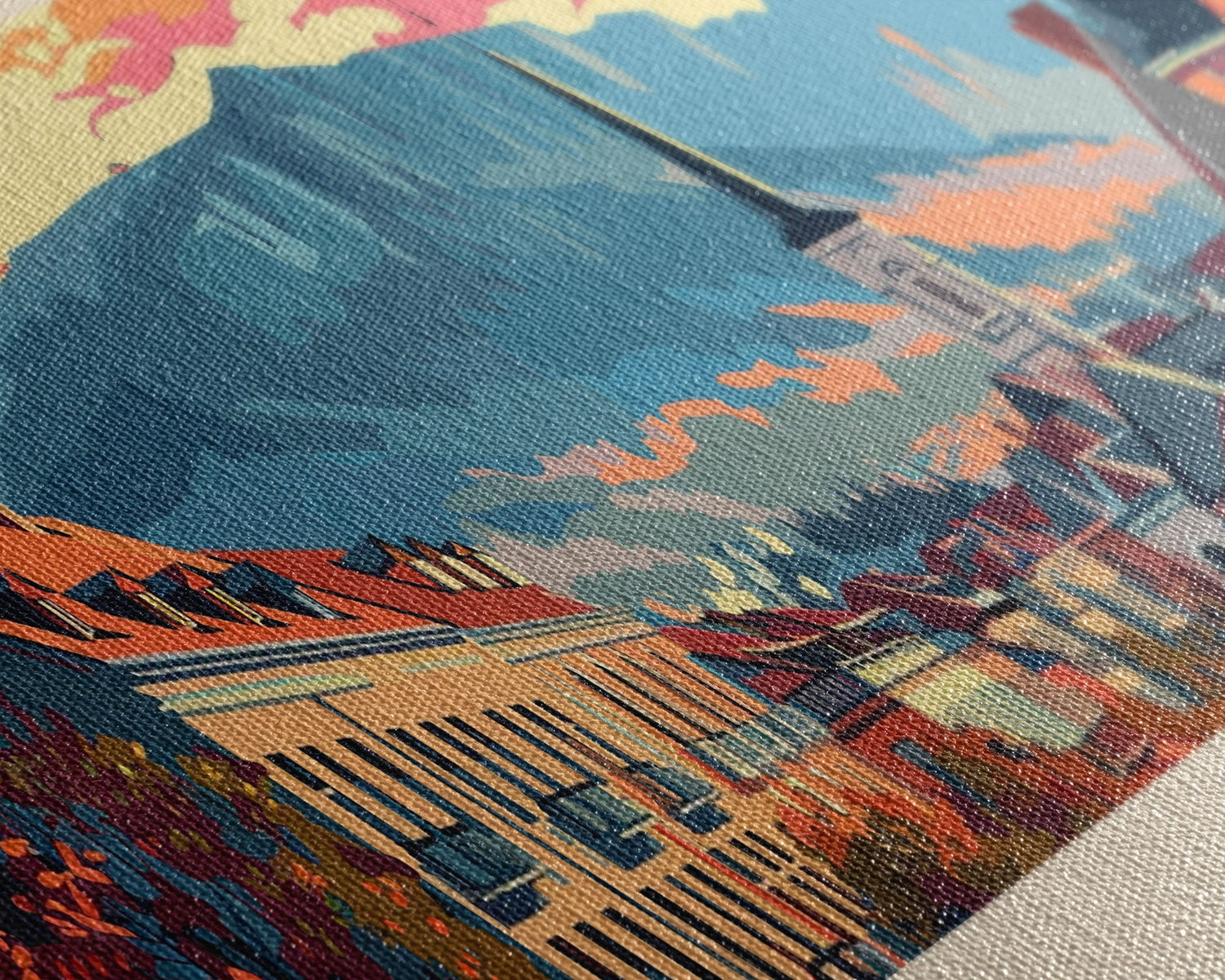 Most of our canvases are made in the USA, with the exception of canvases ordered with the light oak unstained frames, and any large canvases (24x48, 30x60, 16x48 and 20x60) ordered WITH a frame. These are temporarily made in and shipped from Europe, while we try to find a more consistent supplier in the USA.
