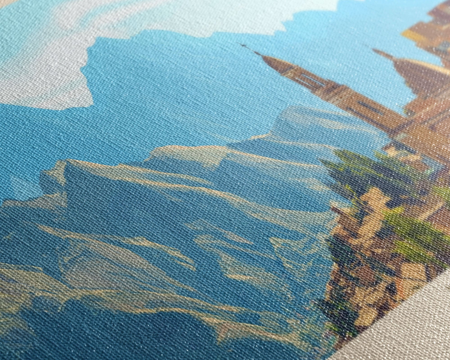 Most of our canvases are made in the USA, with the exception of canvases ordered with the light oak unstained frames, and any large canvases (24x48, 30x60, 16x48 and 20x60) ordered WITH a frame. These are temporarily made in and shipped from Europe, while we try to find a more consistent supplier in the USA.