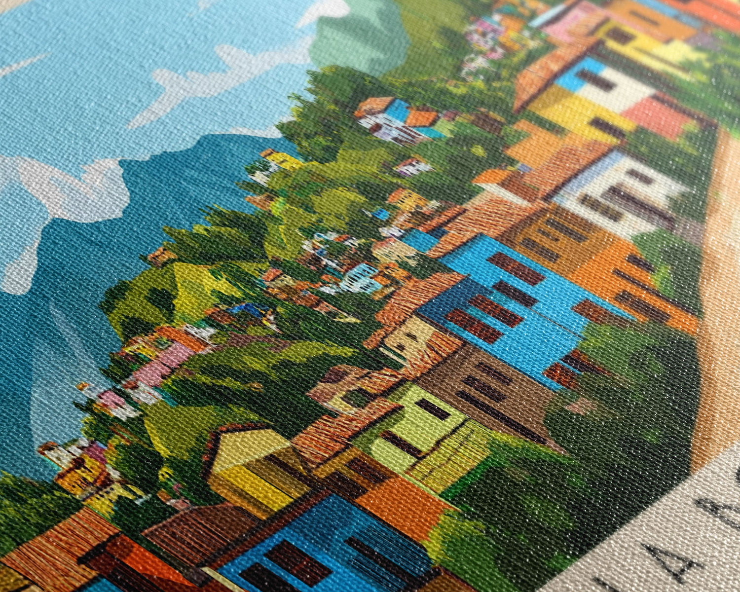 Most of our canvases are made in the USA, with the exception of canvases ordered with the light oak unstained frames, and any large canvases (24x48, 30x60, 16x48 and 20x60) ordered WITH a frame. These are temporarily made in and shipped from Europe, while we try to find a more consistent supplier in the USA.