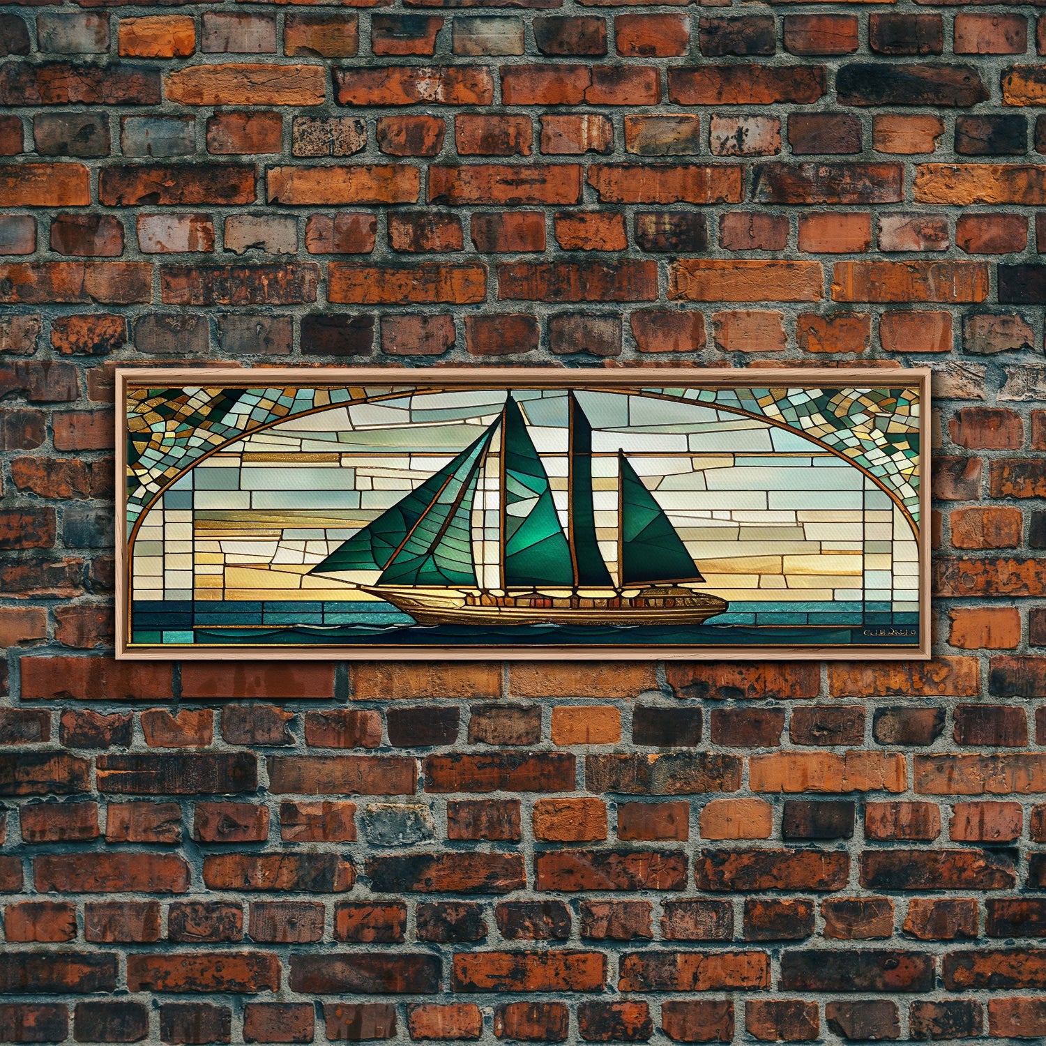 Panoramic Art Deco Sail Boat, Stained Glass, Early 20s Style Art, Roarin' 20s Art, Nautical Theme Framed Canvas Print, Extra Large Art