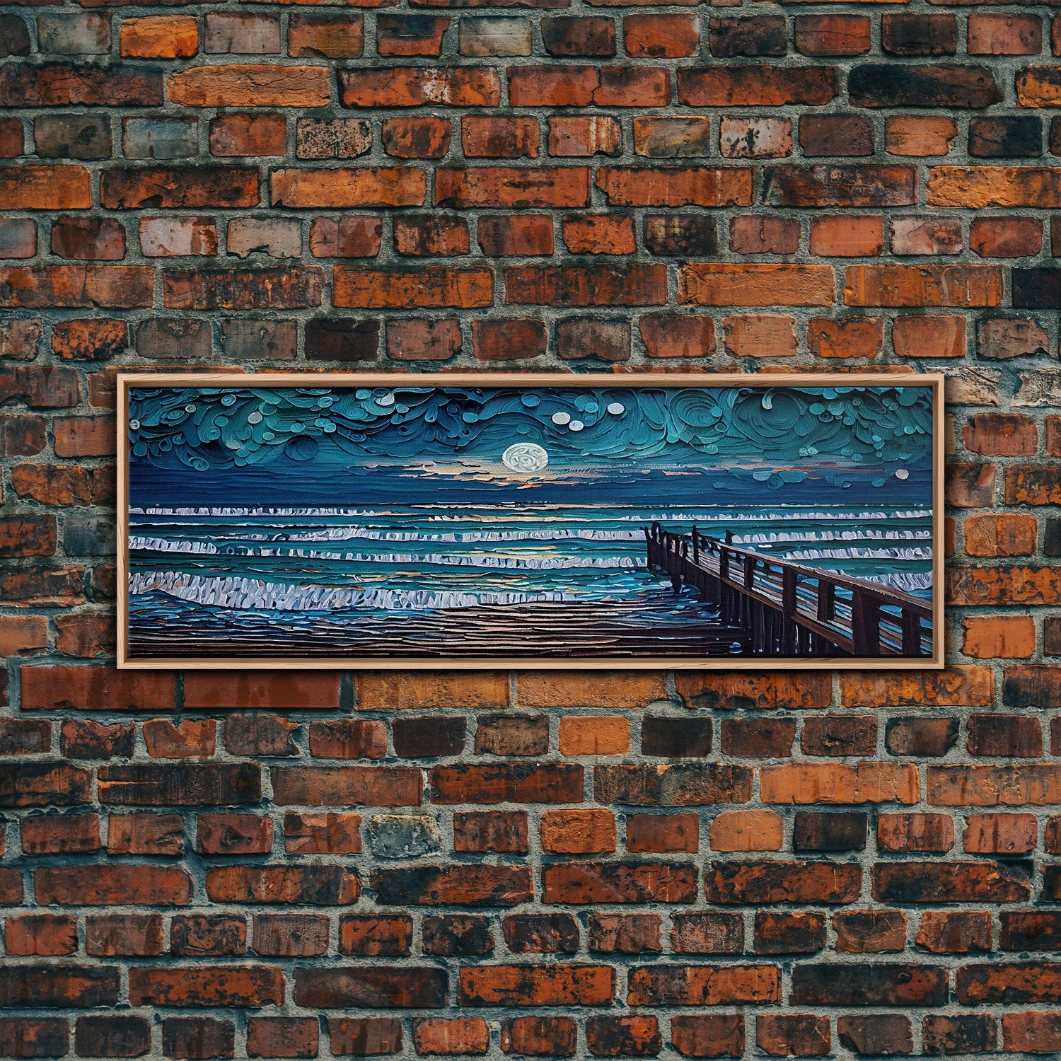 Panoramic Van Gogh Inspired Beach, Framed Canvas Print, Cool Painting, Full Moon Over Rolling Waves, Soothing Abstract Beach Decor