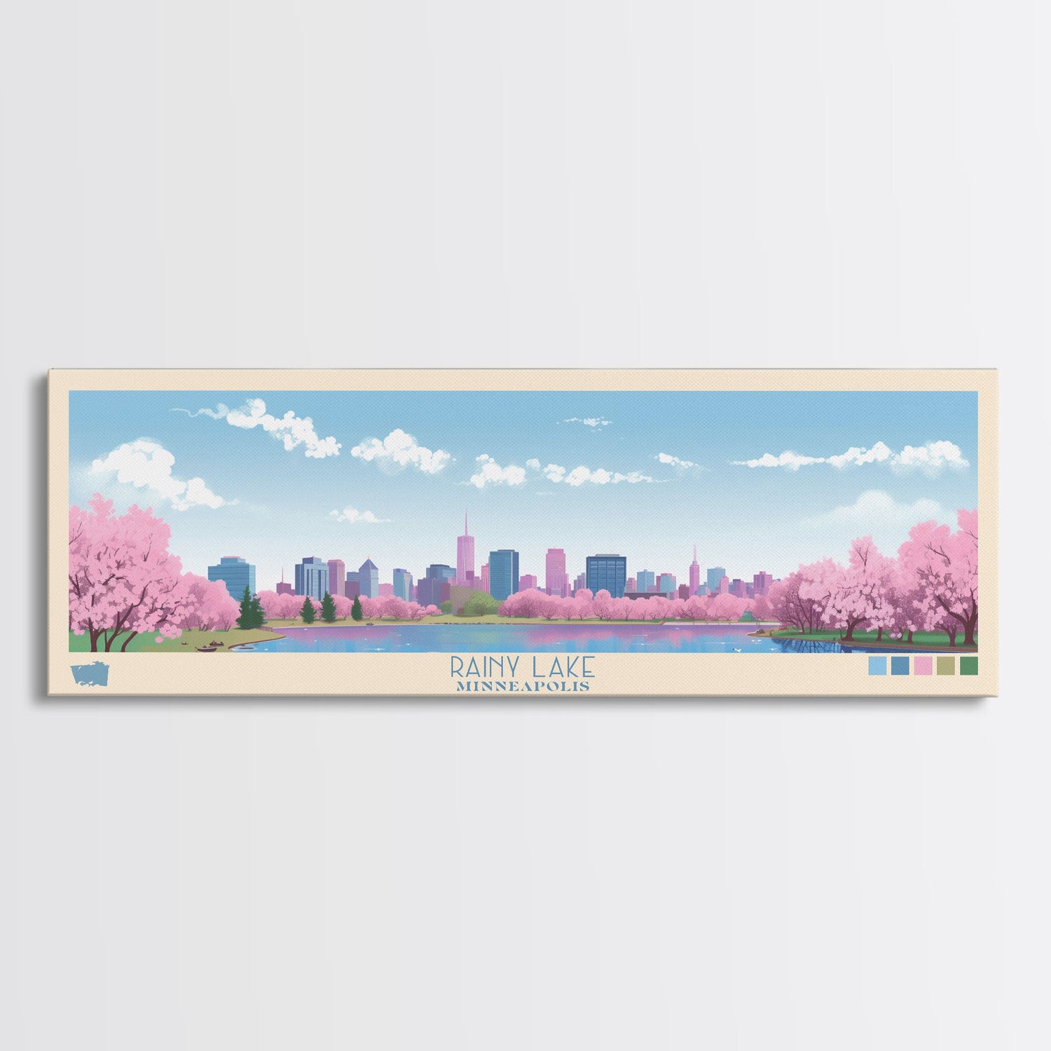 Rainy Lake, Minneapolis Framed Canvas Print, Bedroom Art, Midcentury Modern, Pop Art, Panoramic Wall Art, Travel Poster