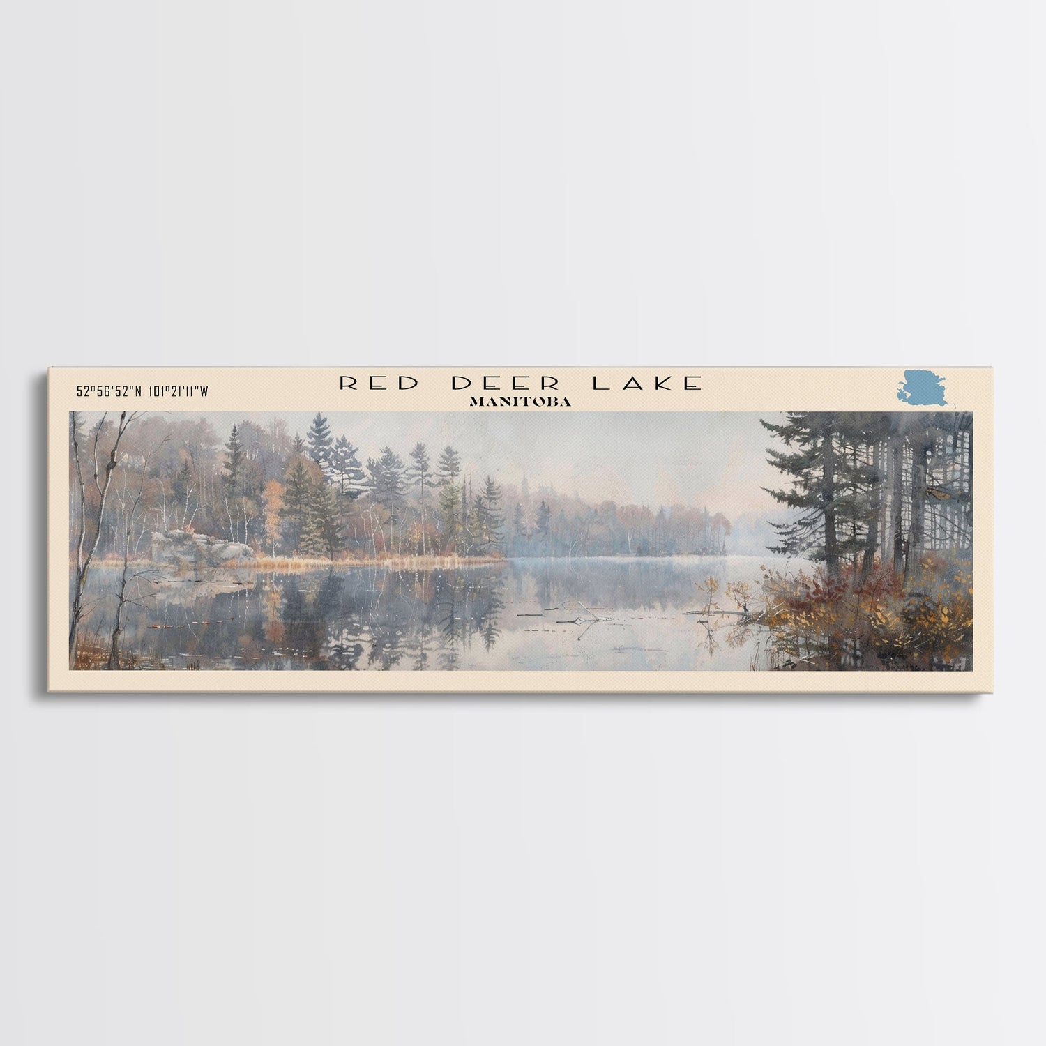 Red Deer Lake Framed Canvas Print, Lake House Decor, Panoramic Wall Art, Travel Poster, Beautiful Landscape Painting, Contemporary Art