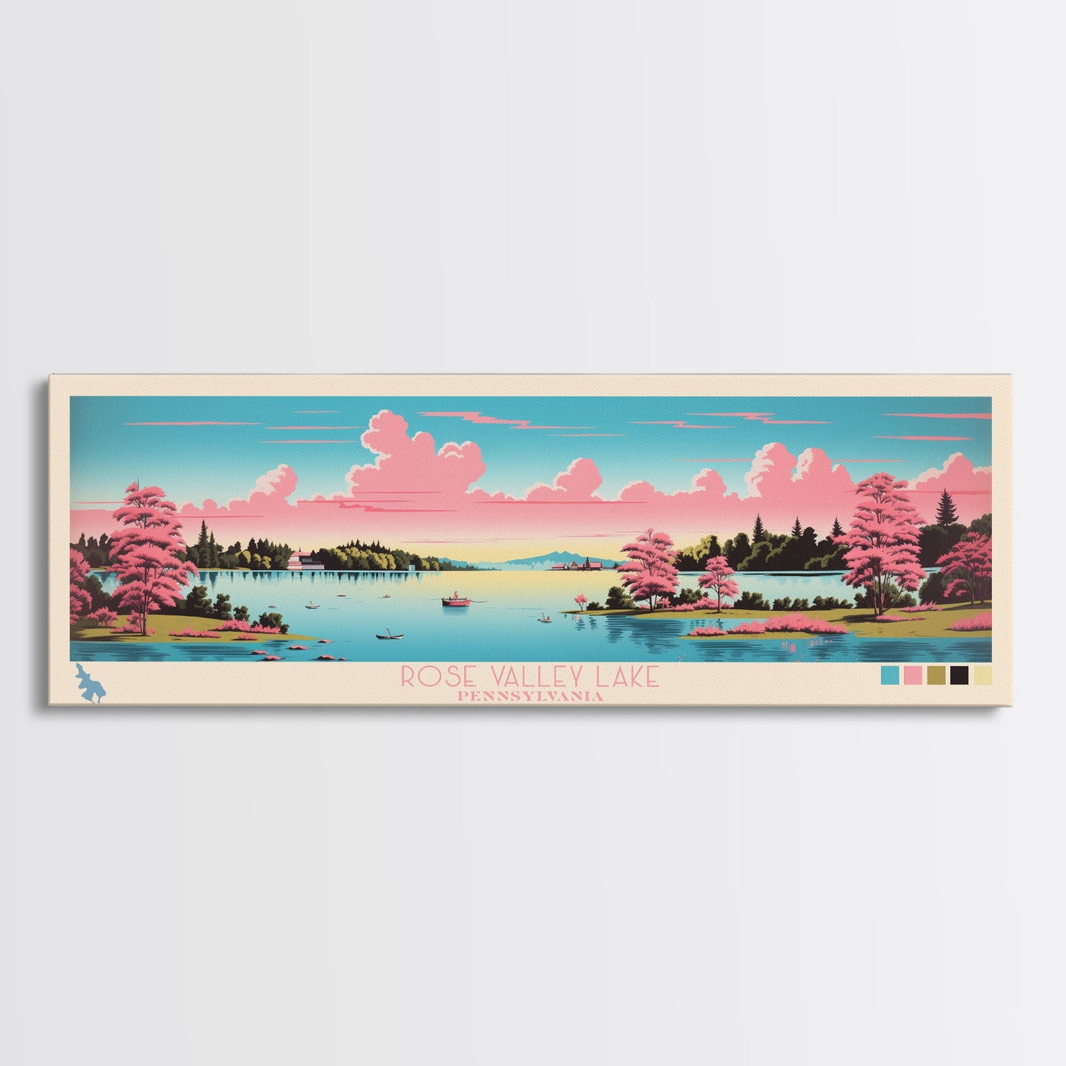Rose Valley Lake, Pennsylvania Framed Canvas Print, Panoramic Travel Poster, Midcentury Modern Art, Bedroom Decor, Pop Art, Wall Art - 10x30 Inches / Gallery Wrap Canvas - Ready To Hang is backordered and will ship as soon as it is back in stock.
