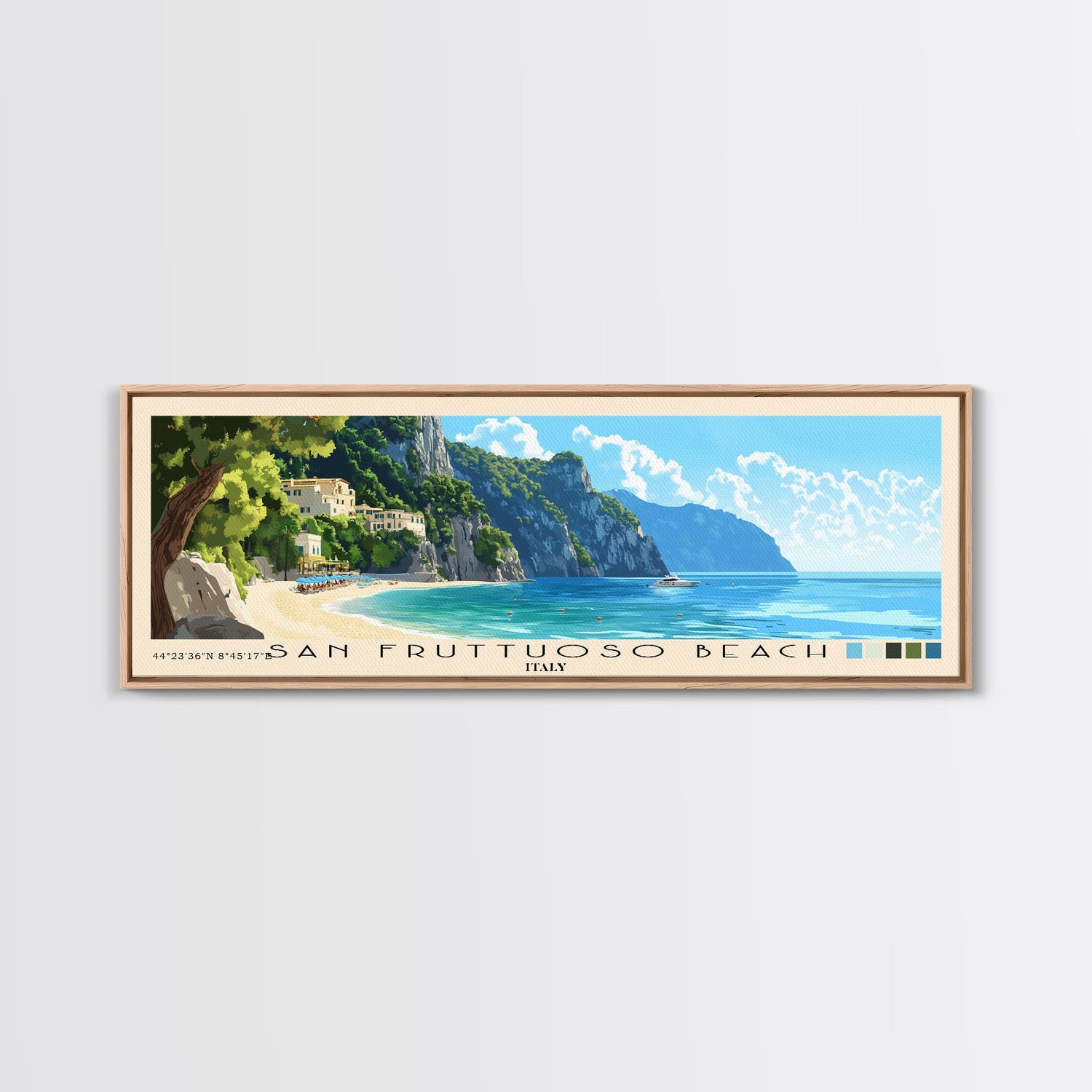 San Fruttuoso Beach, Italy Panoramic Print, Vacation Gift, Italy Wall Art, Beach Painting, Beach Decor, Large Wall Art, Wood Frame Art