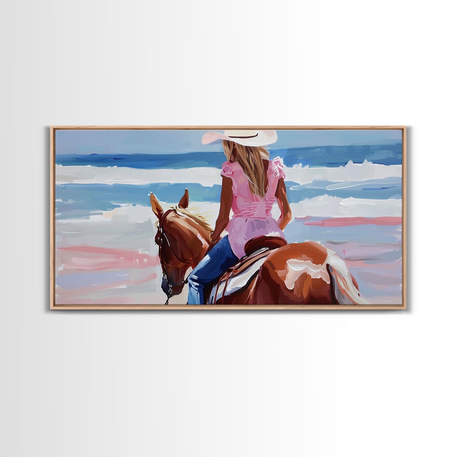 Cowgirl Riding Horse by the Ocean, Tranquil Framed Canvas Print, Perfect for Coastal Living Room Art, Beach Bedroom Decor, Horse Wall Art