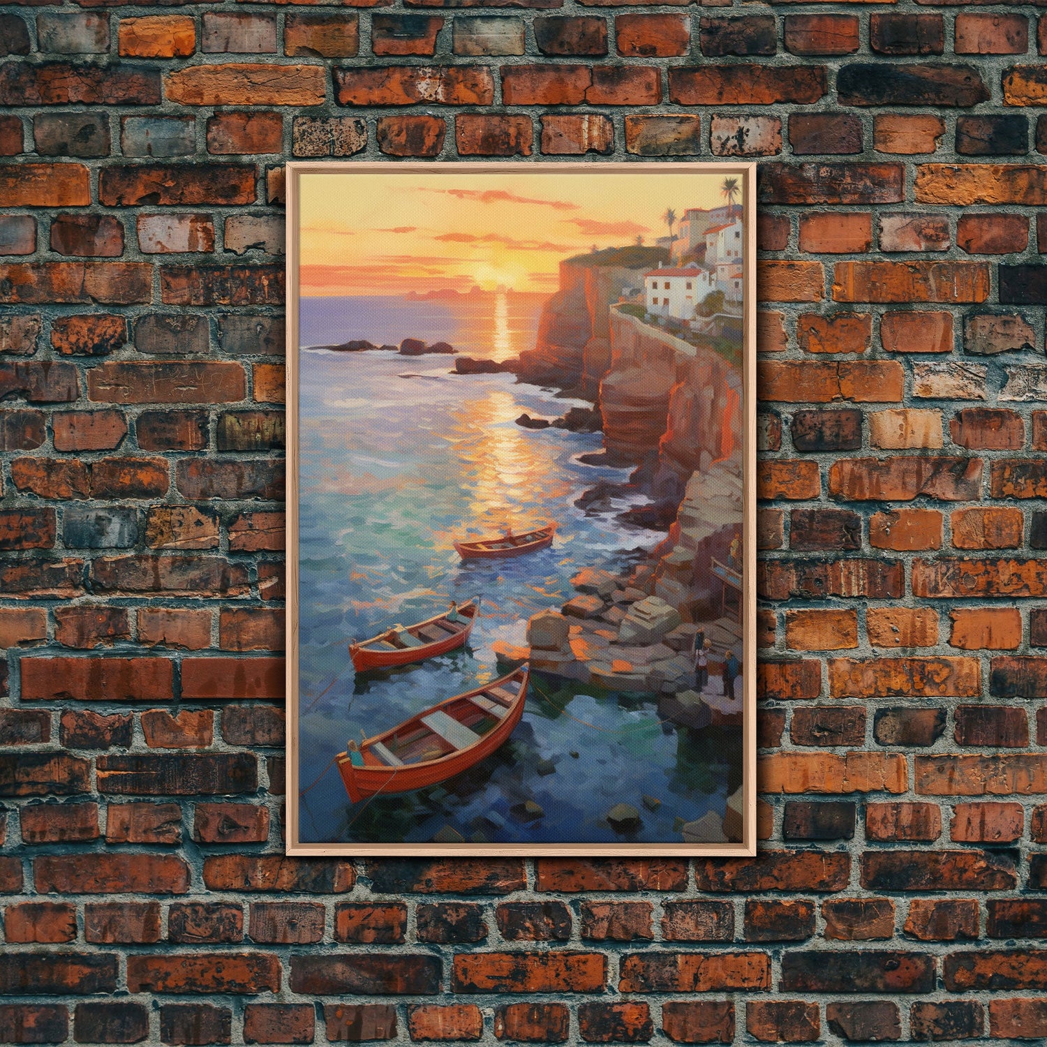 Seaside Town, Boat Wall Art, Ocean Print, Sunset Wall Art, Canvas Print, Wall Art, Vertical Art, Watercolor Art, Couple Gift, Travel Print