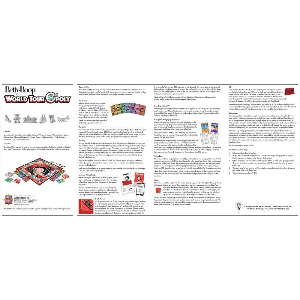 Bring the fun of classic Opoly board games to your next game night with this officially licensed Betty Boop edition, perfect for fans of Betty Boop and collectors of unique board games for adults. Featuring vibrant multicolor artwork and a sturdy metal board, this Betty Boop board game is designed for 2-4 players ages 8 and up, making it a great choice for family gatherings or parties. The game includes all components needed for play and is easy to set up with no assembly required. With a playful money genre and a nostalgic 90s Opoly board game vibe, this edition offers hours of entertainment as you buy, sell, and trade your way to victory. The compact design (10.5 x 15.5 x 2 inches) makes storage simple, while the included safety warning ensures peace of mind for parents. Ideal as a betty bop gift or for anyone who loves board games monopoly style, this edition stands out with its unique Betty Boop World Tour theme. Whether you’re searching for a betty book monopoly experience or a new twist on boardwalk Opoly card game fun, this game delivers excitement and laughter for both unisex-children and unisex-adult audiences. No batteries required.