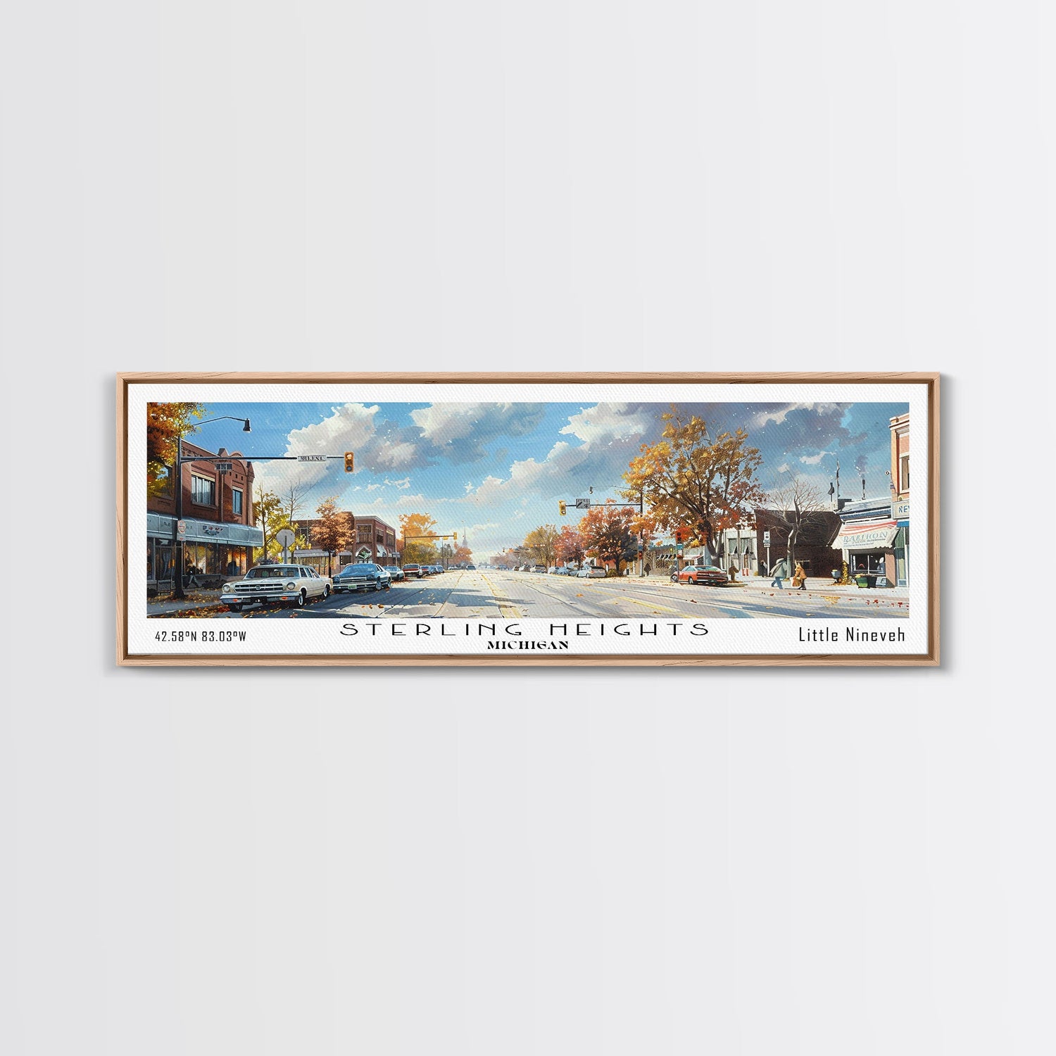 Sterling Heights Michigan Travel Poster, Framed Canvas Print, Office Art, Wall Hanging, Travel Gift, Living Room Art, Vintage Style - 10x30 Inches / Gallery Wrap Canvas - Ready To Hang is backordered and will ship as soon as it is back in stock.