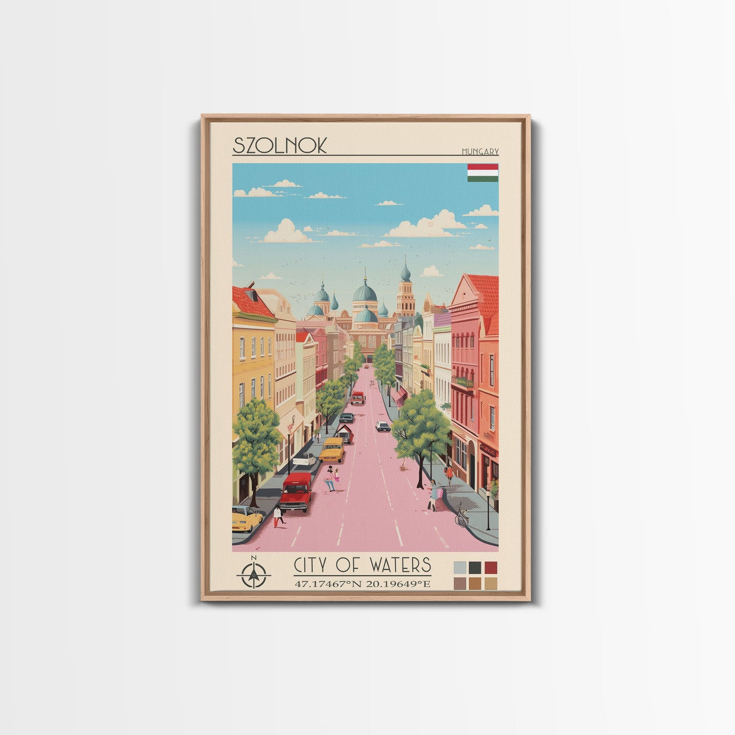 Szolnok Hungary Travel Poster Framed Canvas Print, Midcentury Modern Art, Pop Art Wall Decor, Living Room Art, Home Decoration