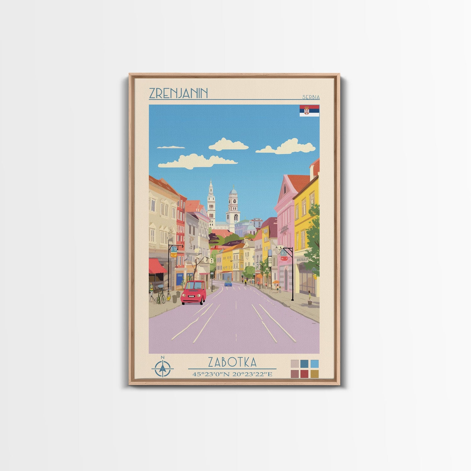 Zrenjanin Serbia Travel Poster Framed Canvas Print, Midcentury Modern Art, Pop Art Wall Decor, Living Room Art, Scenic Wall Art