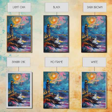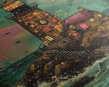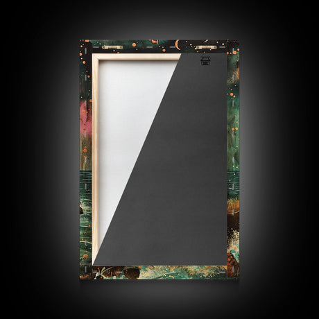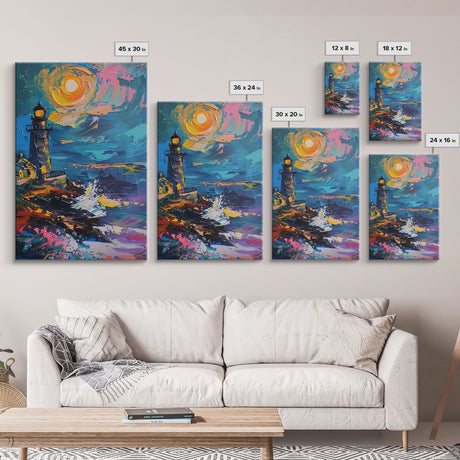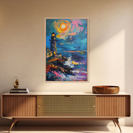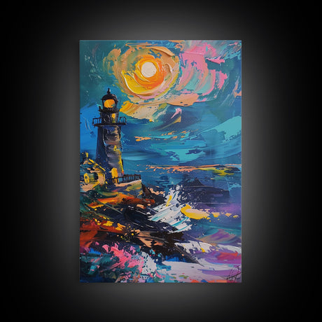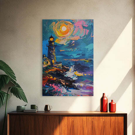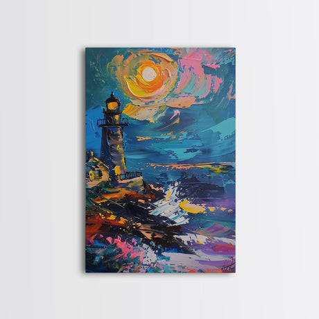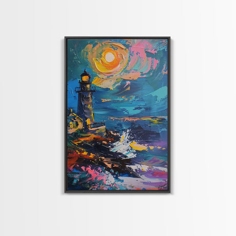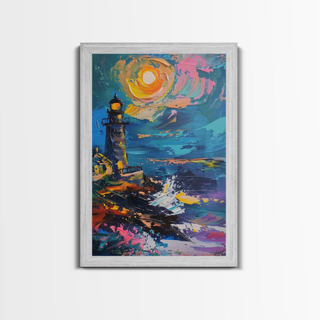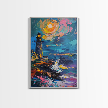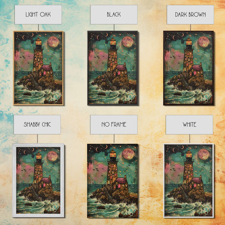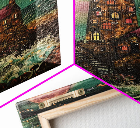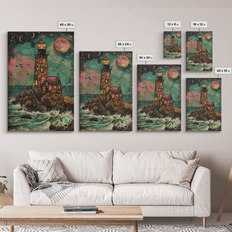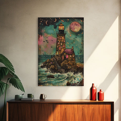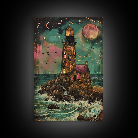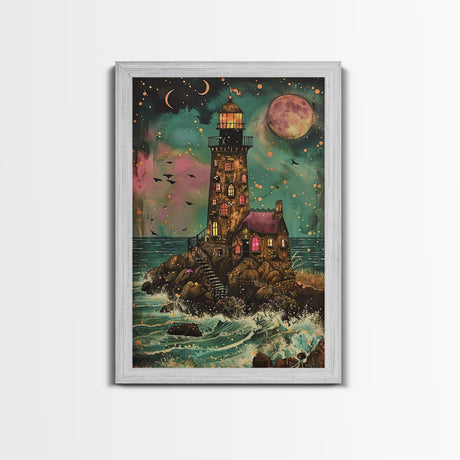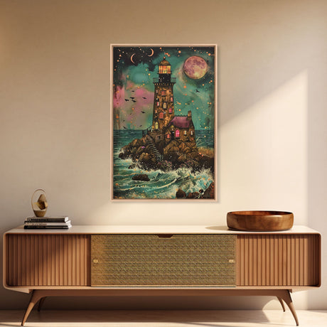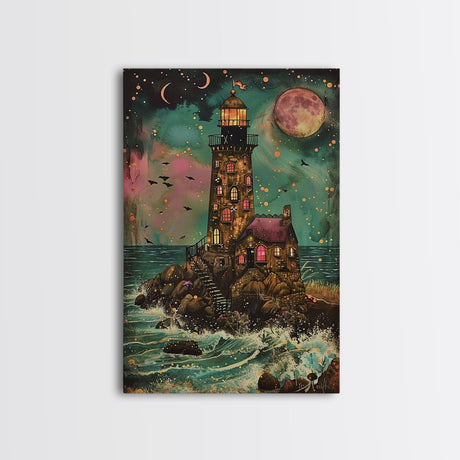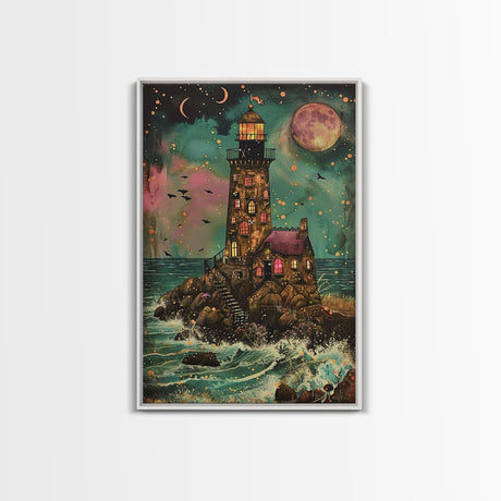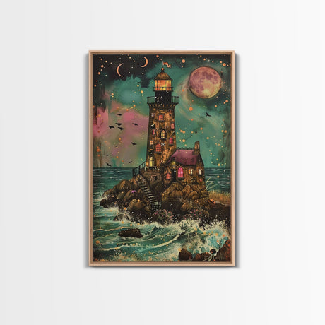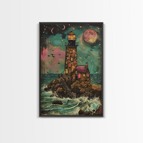 The Haunted Light House Framed Canvas Print, Retro Style Halloween Decor, Cottage Core Halloween Art