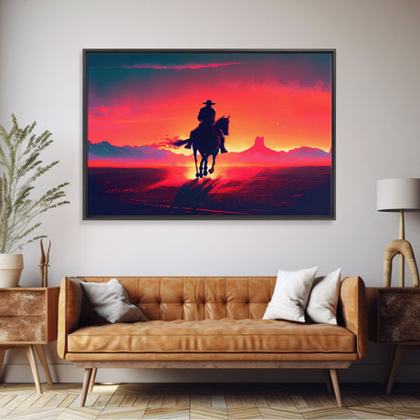 The Sunset Ride, Wild West Cowboy Art, retro style western decor, framed canvas print
