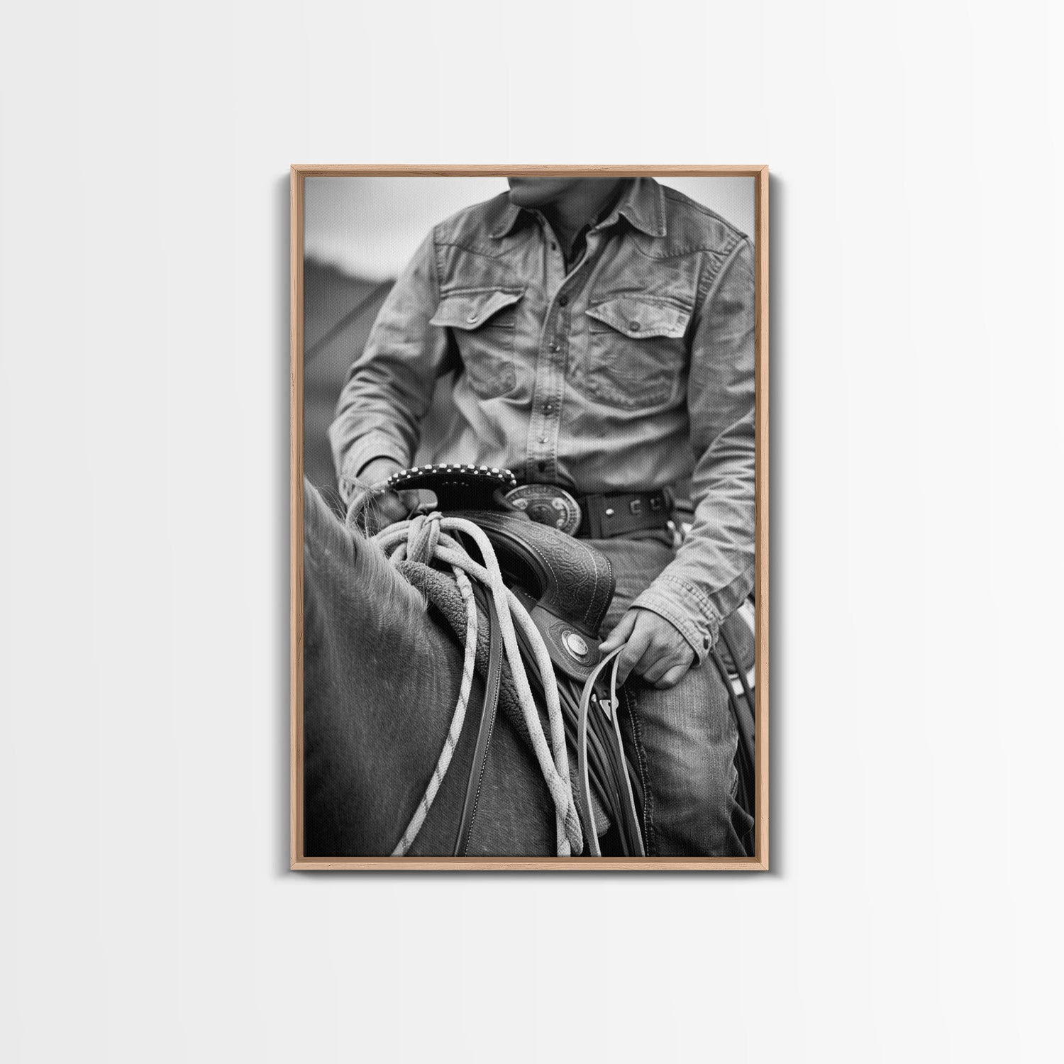 Close-up of cowboy hands holding reins, detailed Western art, black and white photography, Framed Canvas Print, rustic home decor, wall art