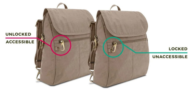 The patented latching hardware allows you to lock your valuables inside, keeping the hands of pickpockets out