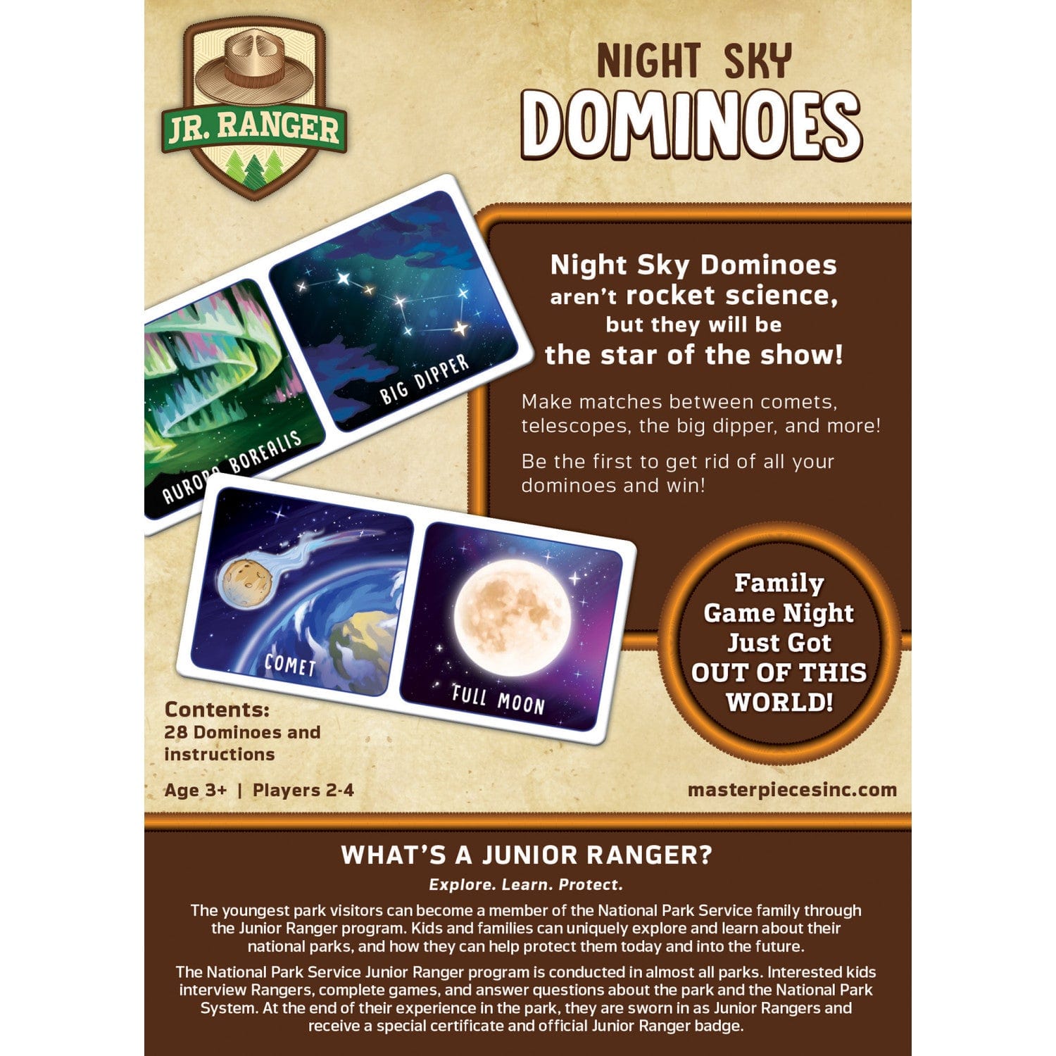 Introducing MasterPieces Jr. Ranger Night Sky Dominoes National Parks Edition! These aren't your average dominoes. Inspired by our nation's stunning parks, they're perfect for families and friends ages 3 and up. Match tiles with comets, telescopes, and more night sky objects. Be the first to clear your dominoes to win! With 28 pieces, a game board, and rules sheet included, gather your friends for some starlit fun. Night sky dominoes are a must-have for astronomy enthusiasts and outdoor lovers alike. Enjoy the magic of the cosmos while playing this captivating game!