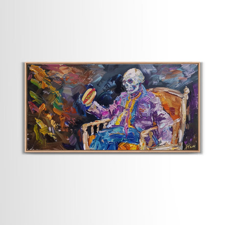 Skeleton Havin' a Hot Dog, Framed Canvas Print, Funny Halloween Decor