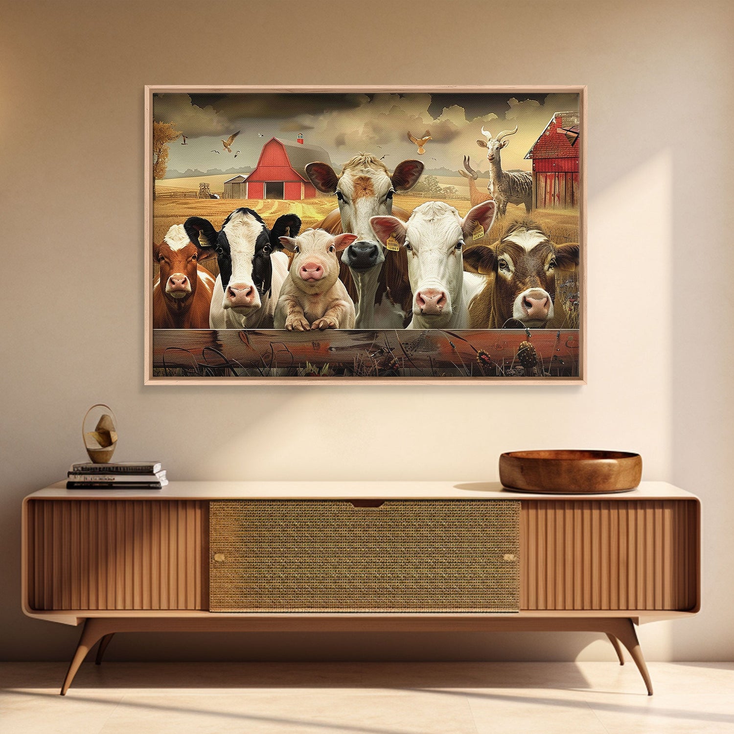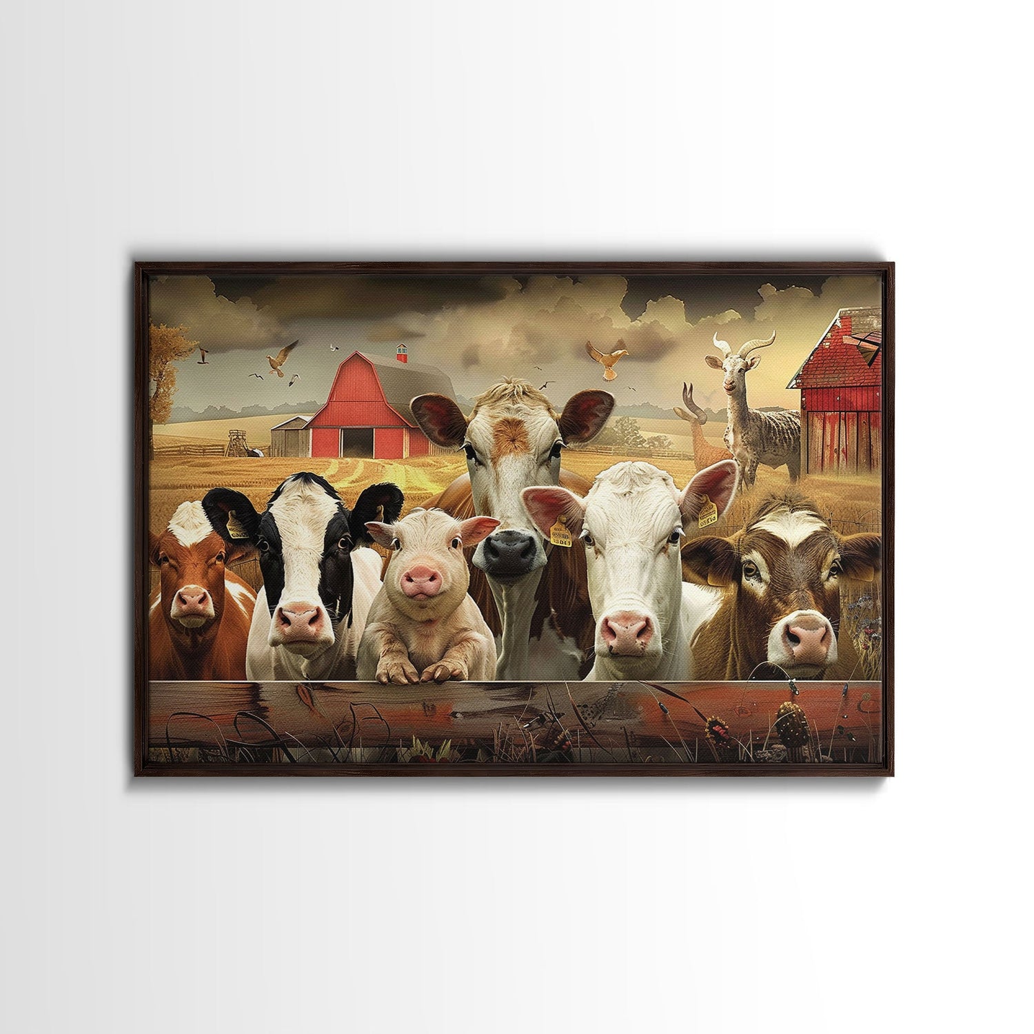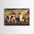 Farm Animals On The Fence, Framed Canvas Print, Cute Animal Decor, Bathroom Wall Art, Illustration, Home Decor