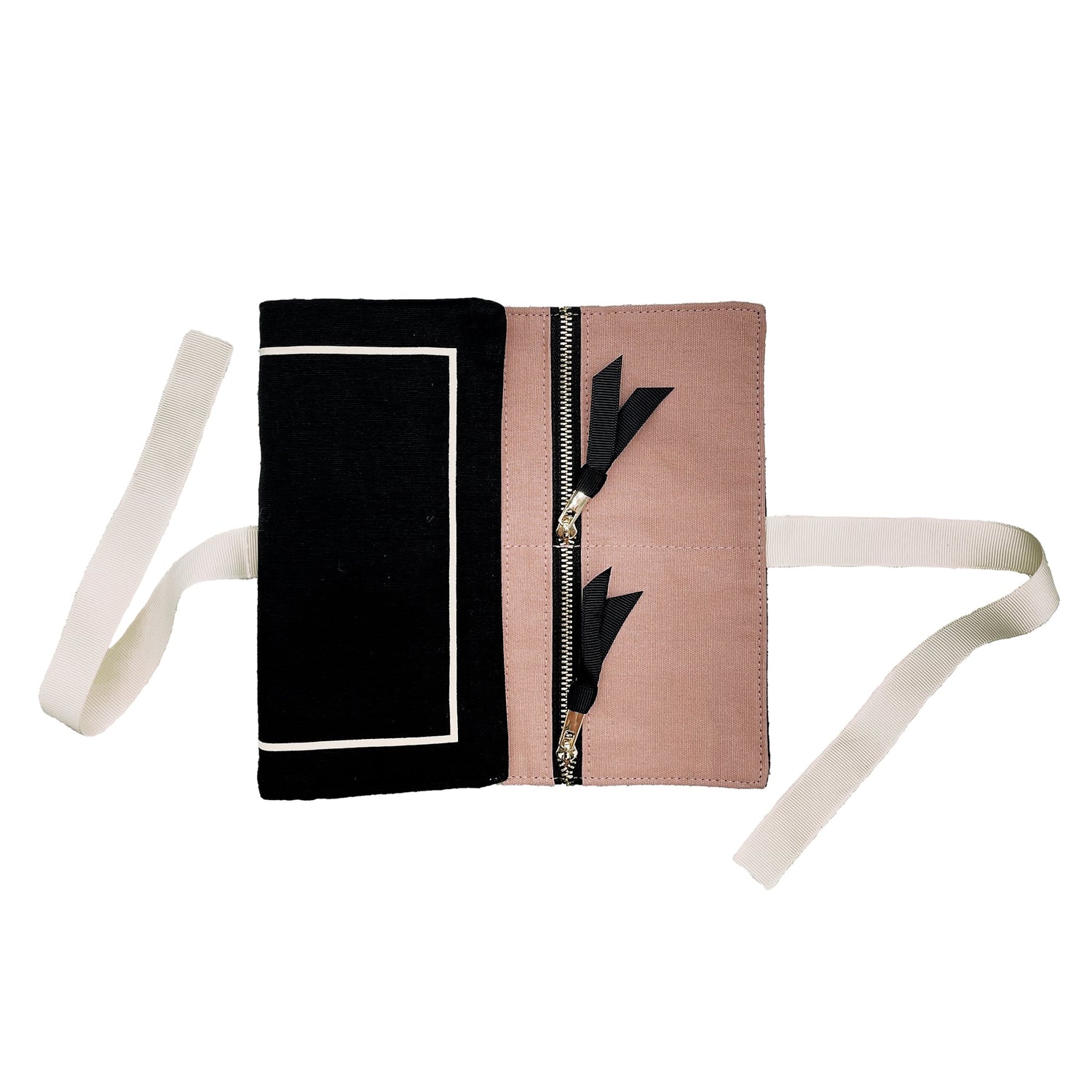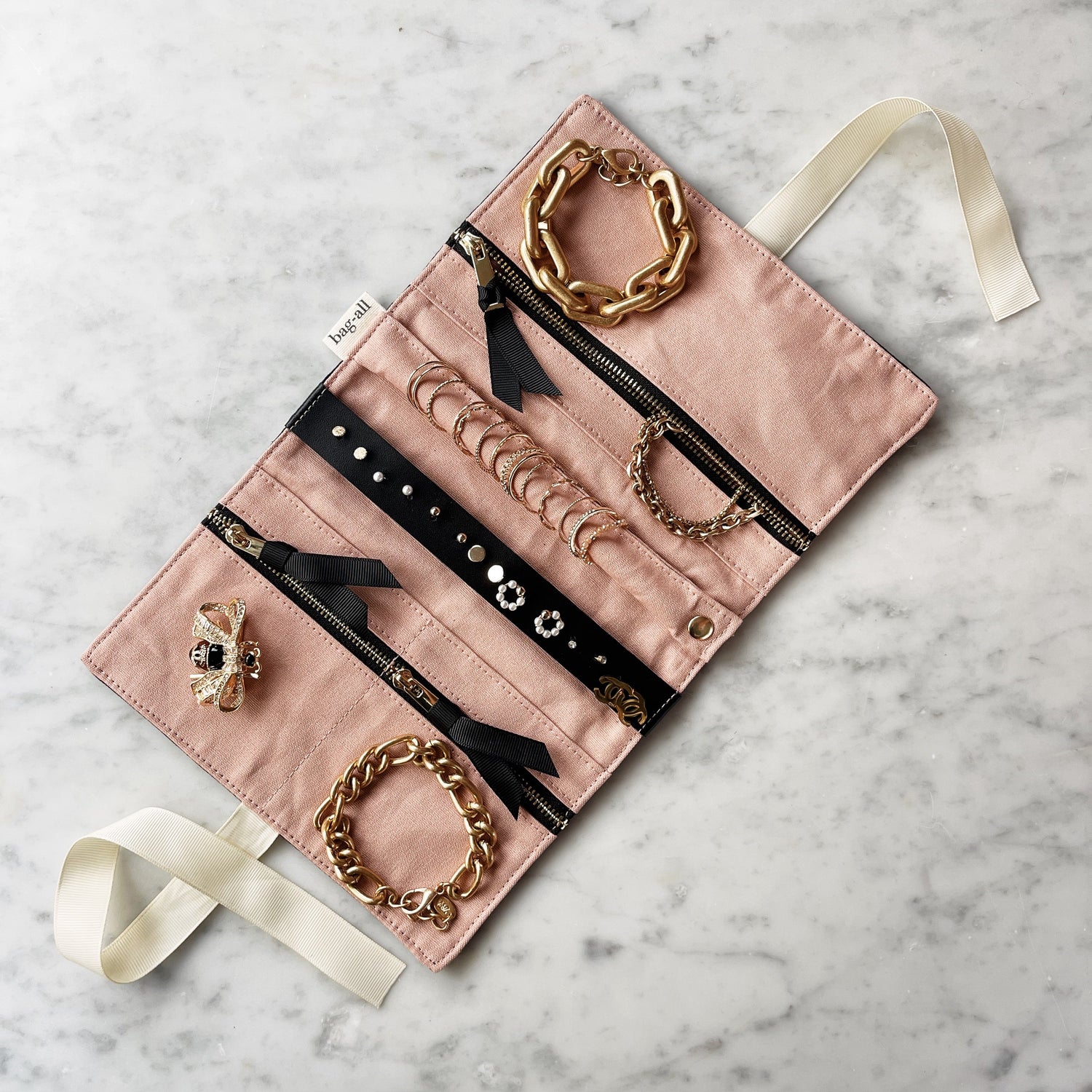 Say goodbye to tangled necklaces and misplaced earrings with our stylish Couture Jewelry Roll, Medium in black with cute pink lining. Designed for both travel and home use, this organizer is a must-have for every jewelry lover. With three convenient zipper compartments, you can keep your precious accessories neatly organized and easily accessible. The genuine leather earring holder ensures that your earrings stay secure, while the padded ring holder keeps your rings protected. Plus, this sleek and elegant pouch can be effortlessly rolled up or unfolded, and you can even personalize it with a monogram for that extra special touch. Invest in this functional and elegant solution to keep your jewelry untangled and effortlessly organized, wherever you go.