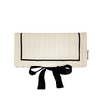 Say goodbye to tangled necklaces and misplaced earrings with our stylish Couture Jewelry Roll, Medium in our custom cream color with cute striped lining. Designed for both travel and home use, this organizer is a must-have for every jewelry lover. With three convenient zipper compartments, you can keep your precious accessories neatly organized and easily accessible. The genuine leather earring holder ensures that your earrings stay secure, while the padded ring holder keeps your rings protected. Plus, this sleek and elegant pouch can be effortlessly rolled up or unfolded, and you can even personalize it with a monogram for that extra special touch. Invest in this functional and elegant solution to keep your jewelry untangled and effortlessly organized, wherever you go.