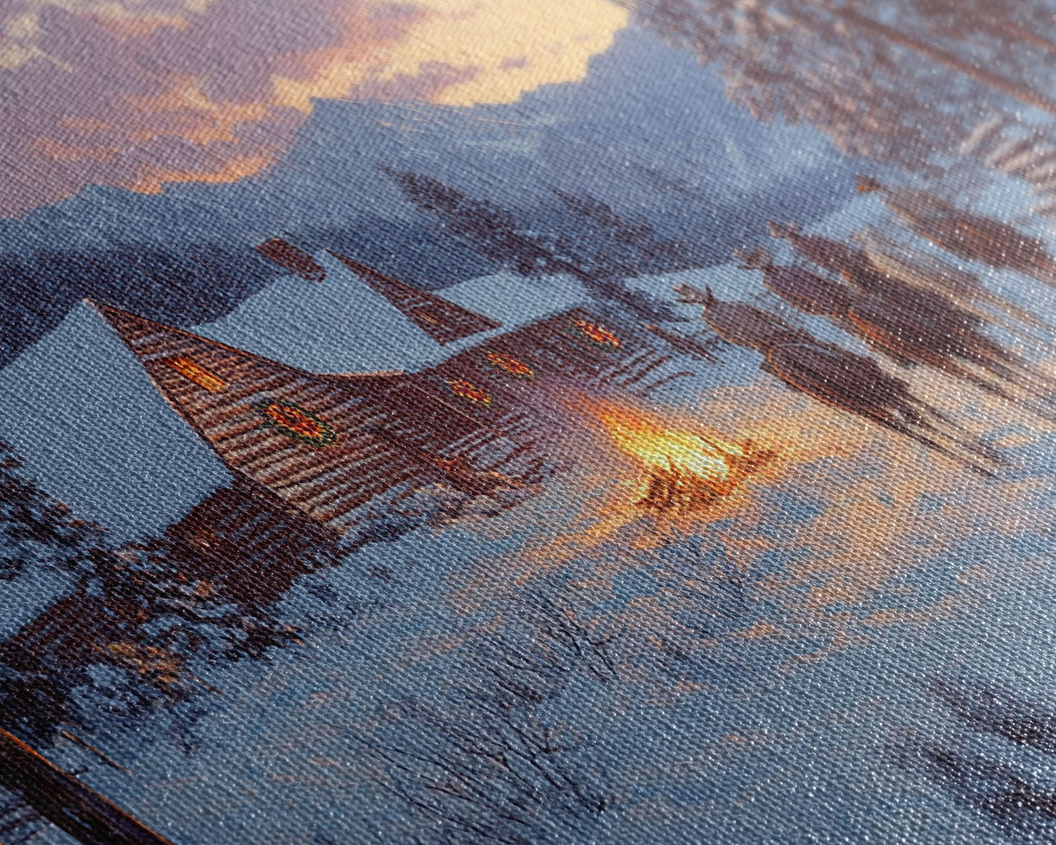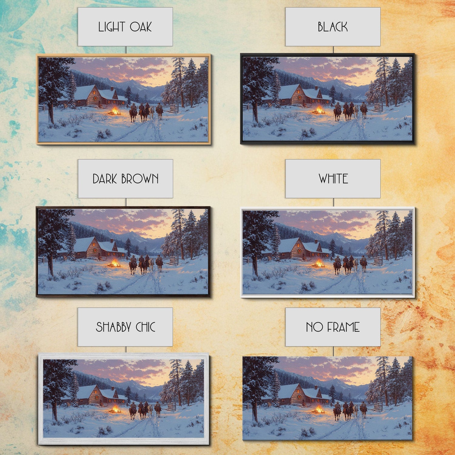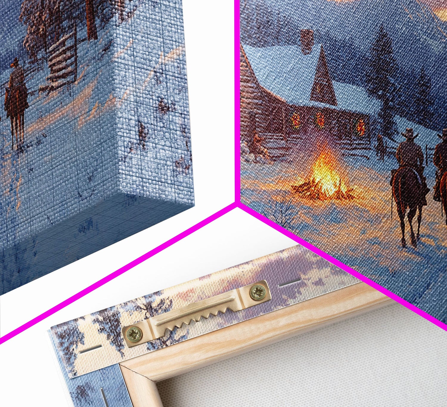 Cowboys and Log Cabin Winter Christmas Framed Canvas Print, Rustic Mountain Holiday Scene Art, Best Christmas Gift Idea, Winter Decor