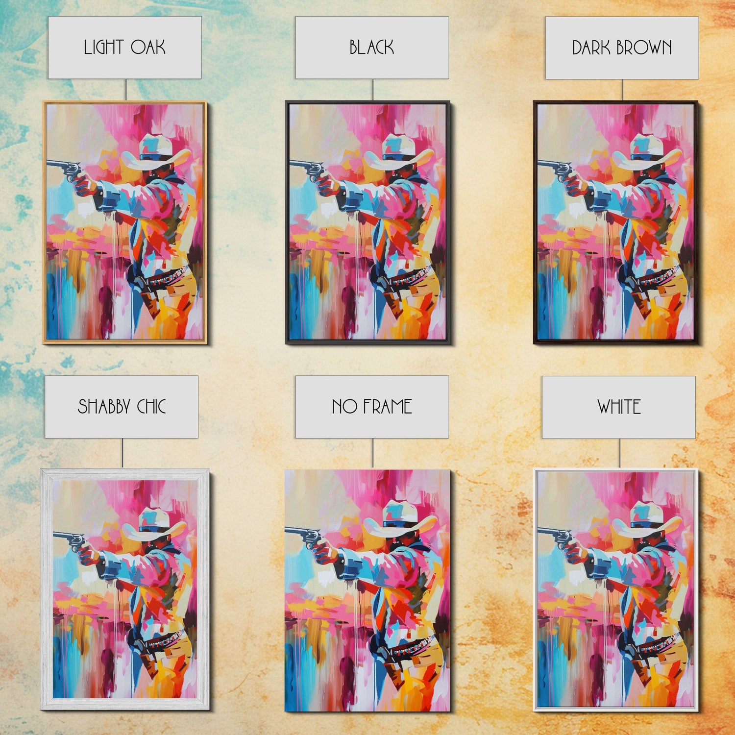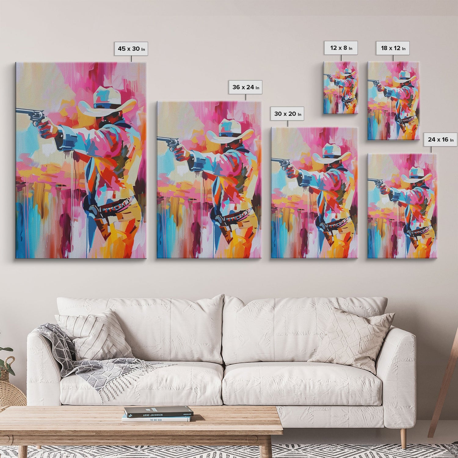 Dynamic Cowboy with Gun - Framed Canvas Print, Action-Packed Western Art, Bold Cowboy Wall Art for Living Room Decor