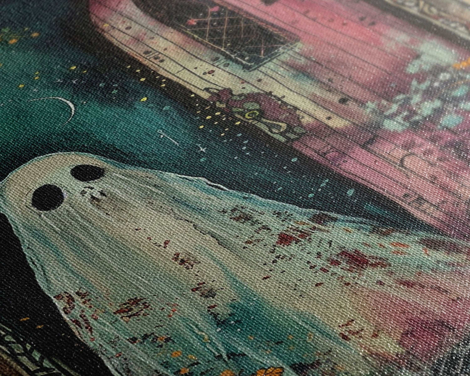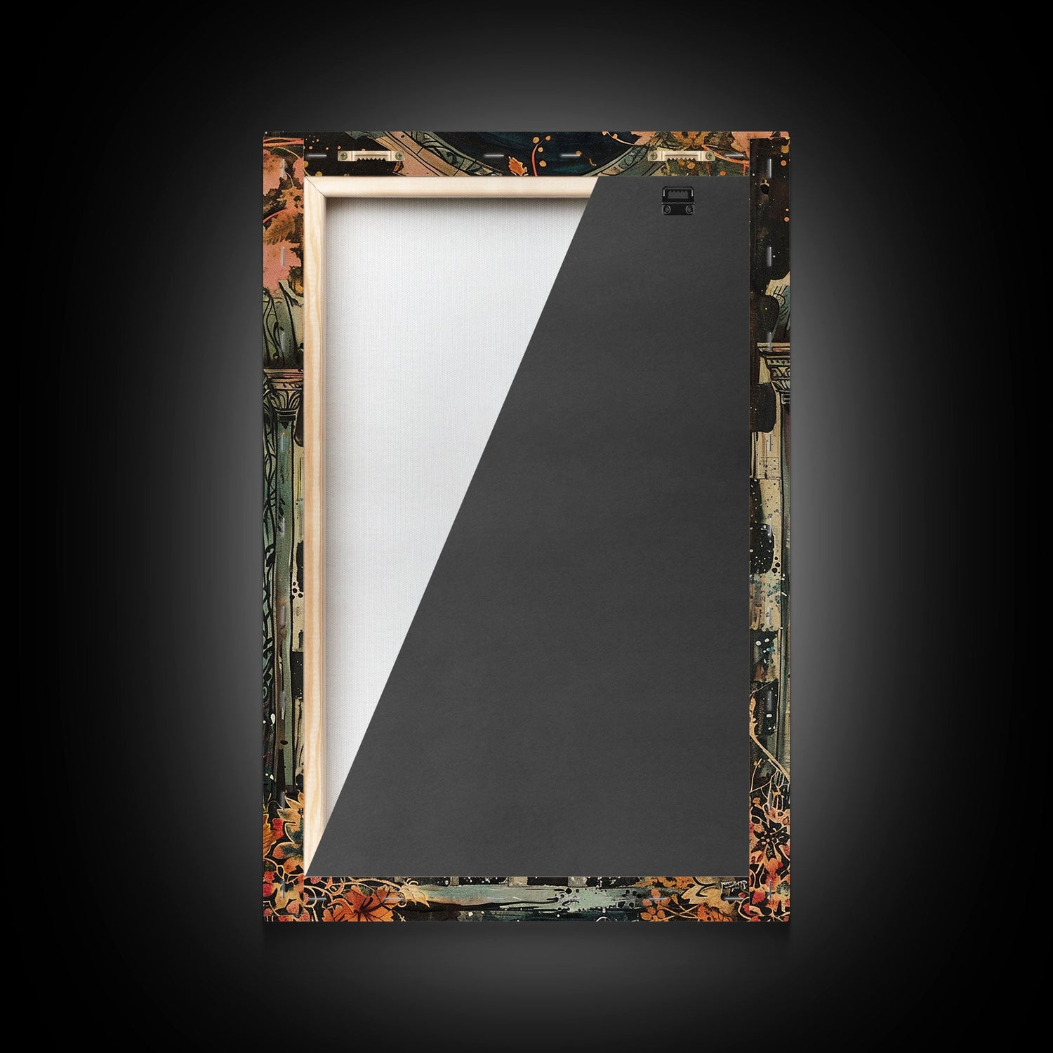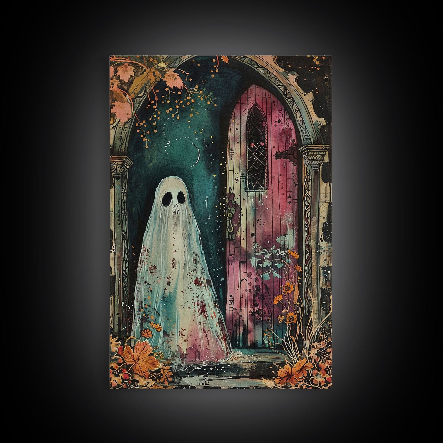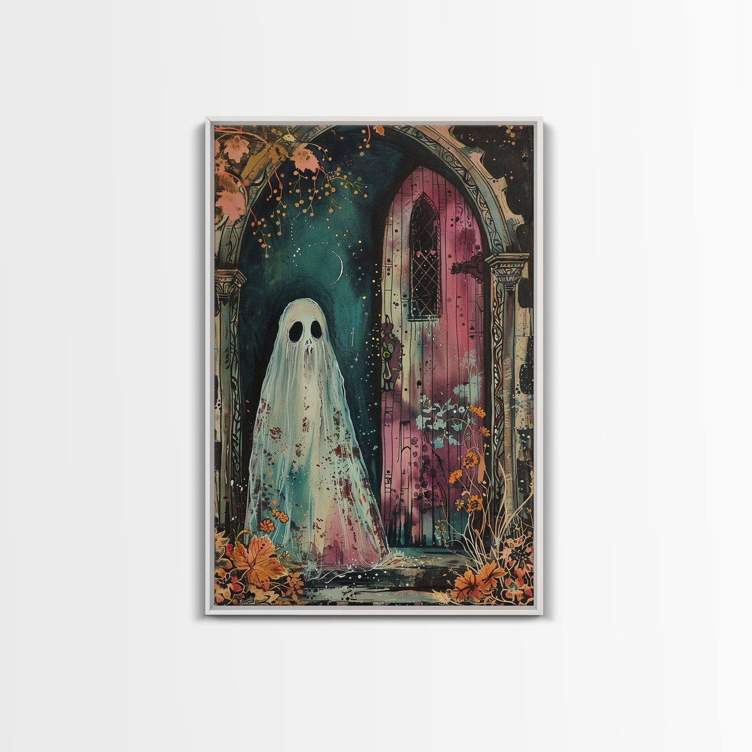 Ghostly Figure at Haunted Door Framed Canvas Print, Halloween Spirit Decor, Spooky Ghost Art, Haunted House Wall Art, Creepy Ghostly Print